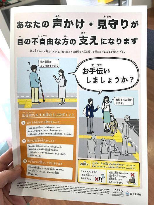 ホームドアと同じくらい安全確保のために大切なことが、周囲の人たちの声掛けです。視覚障害があると、自分に対して話しかけられている事が分からない場合もあり、「盲導犬を連れた方(お客様)」あるいは「白杖を持っている方(お客様)」と、声をかけ、視覚障害者自身に対して呼びかけていることが分かるようにすること。また、今回のように危険が迫っている場合には、「危ない」等ではなく、「止まってください」と呼びかけ、まず、行動を止め、次に安全な場所へ手引きする必要があります。
