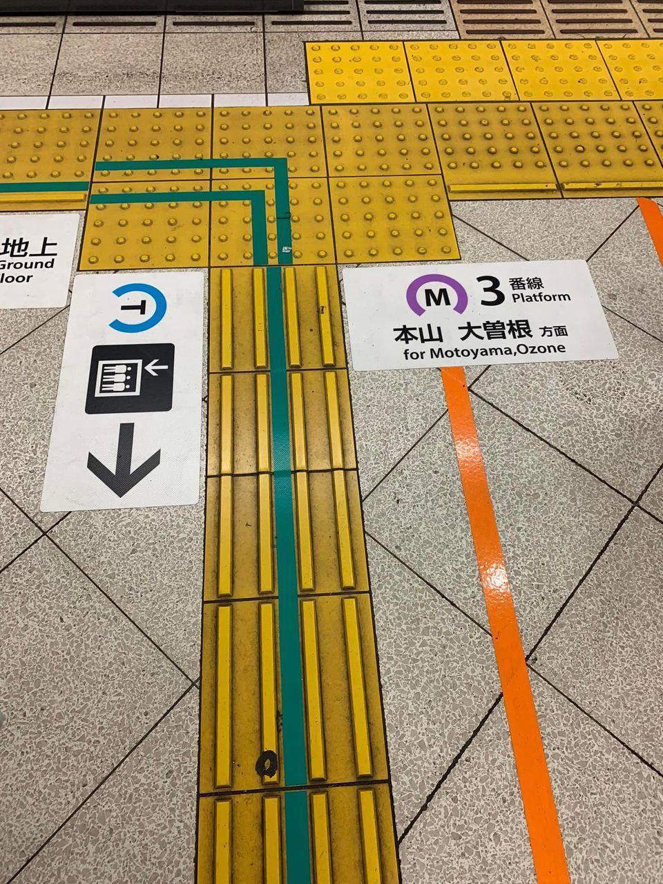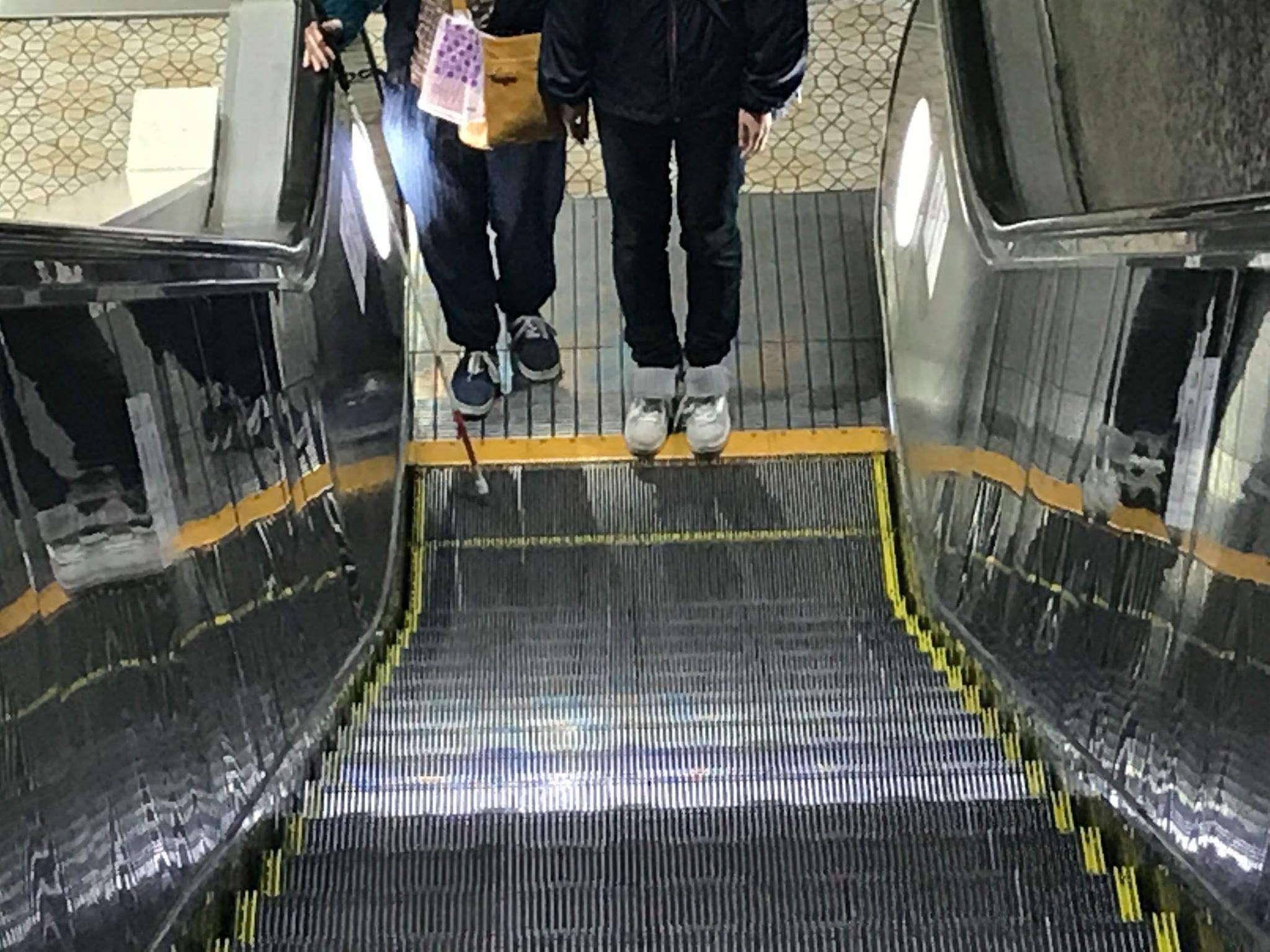 盲導犬と共にホームを移動する場合、転落防止のためホームの端側に盲導犬がくるように歩行することが原則ですが、階段や出口の位置関係によっては、人がホームの端側を歩くこともあります。また、安全であるホームの中央付近は、柱、売店、椅子の他、電車を待つ人などで、ホームの端しか歩行空間が確保できない場合もあります。そして、障害物を避けているうちに方向がずれたり、地下鉄などの音が反響する場所では、自分の位置が判断しにくく危険が増します。