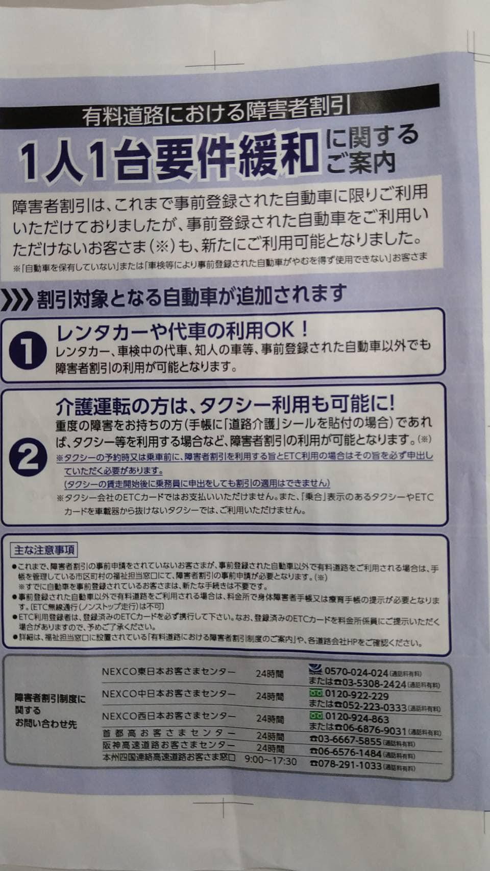 今までは登録している1台のみ(実質、本人か家族名義)の割引きというしばりで、視力障害と両下肢障害があるのと、身内で運転できる人がいないので、高速道路利用の時の負担が大きく困っていました。