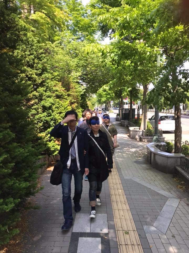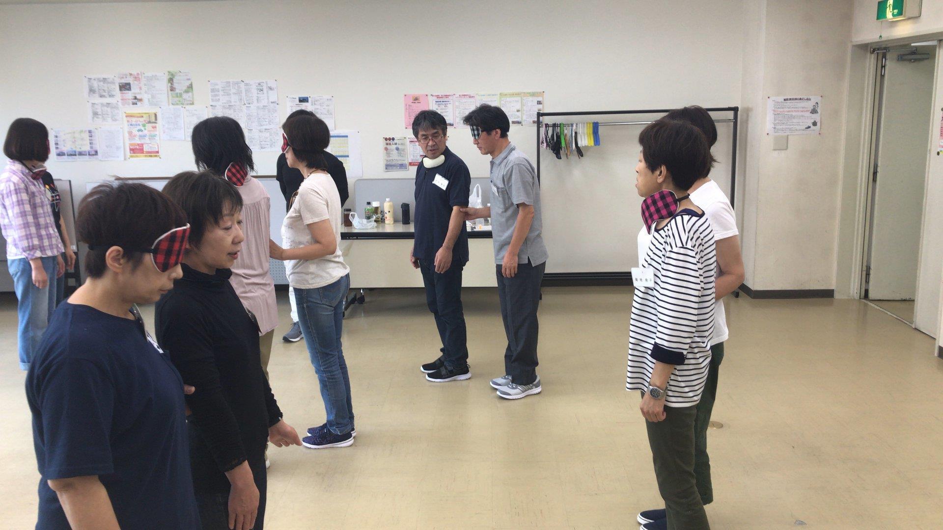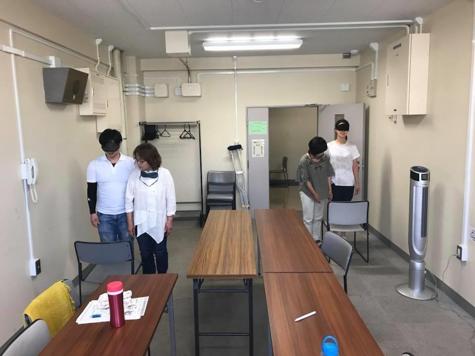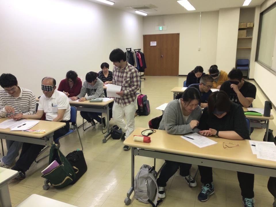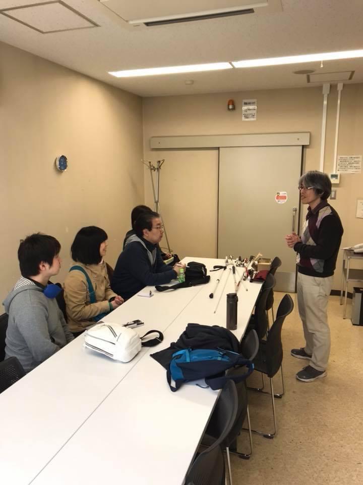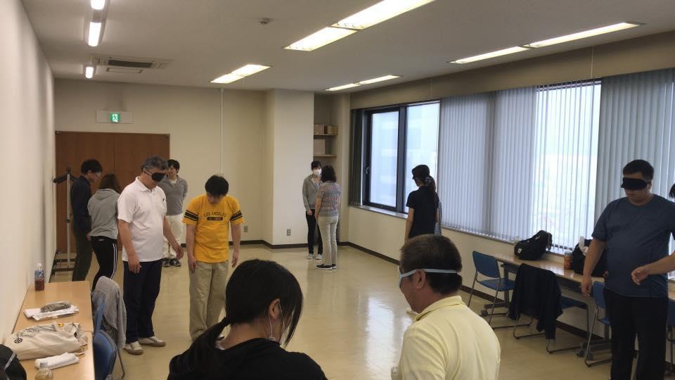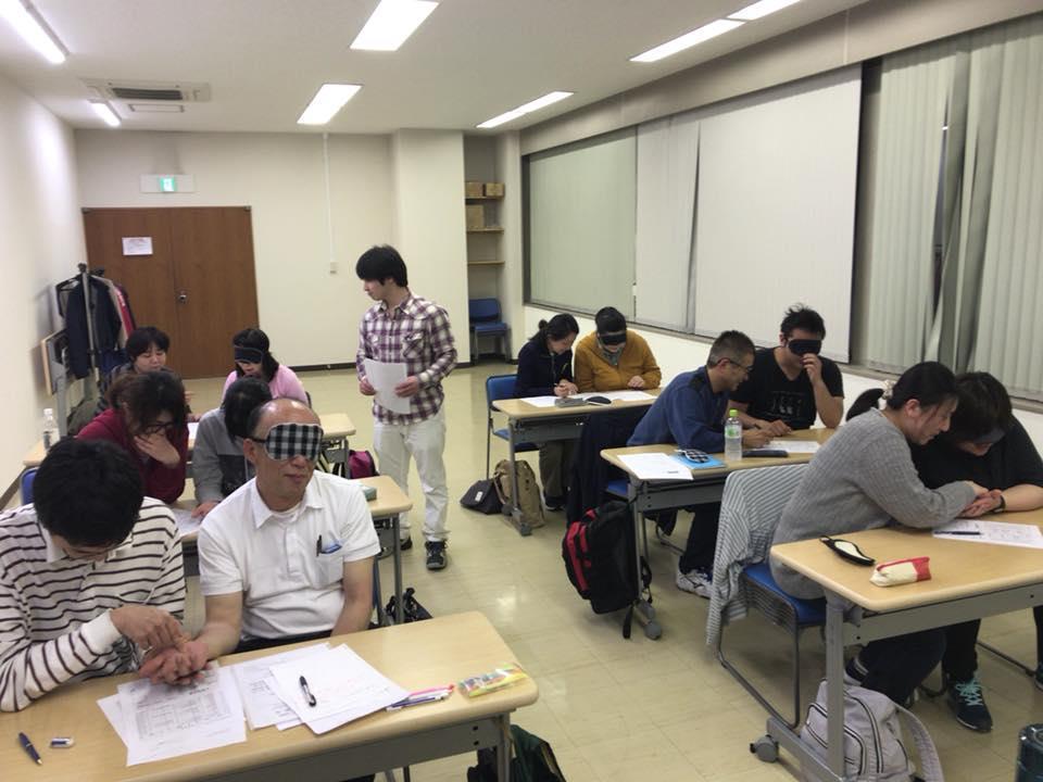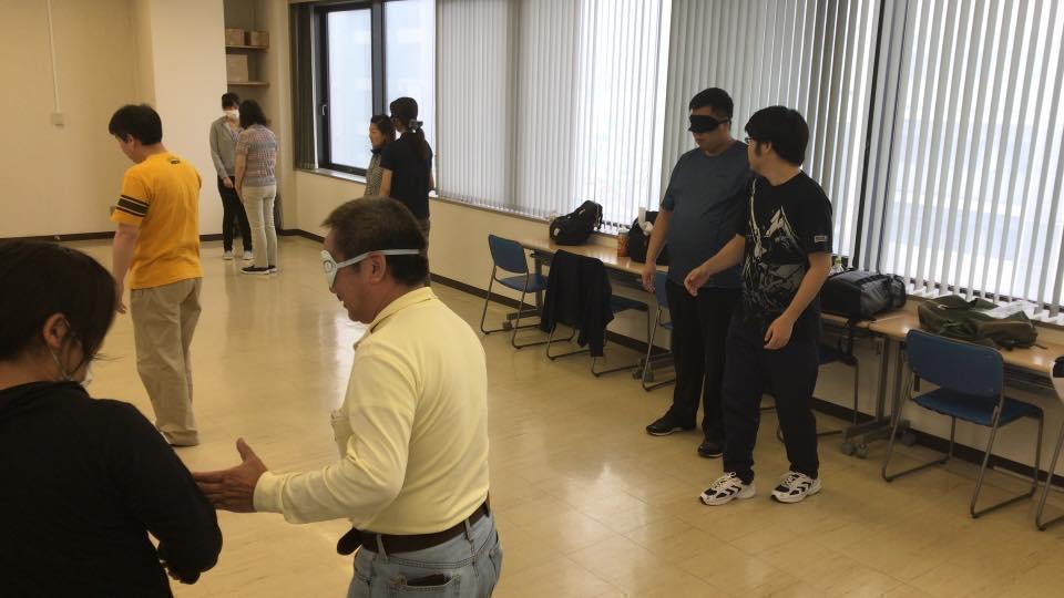 今回は18:00~21:00/9:00~16:30と2日間にかけて、視覚障害者との外出支援の基本を学びました。