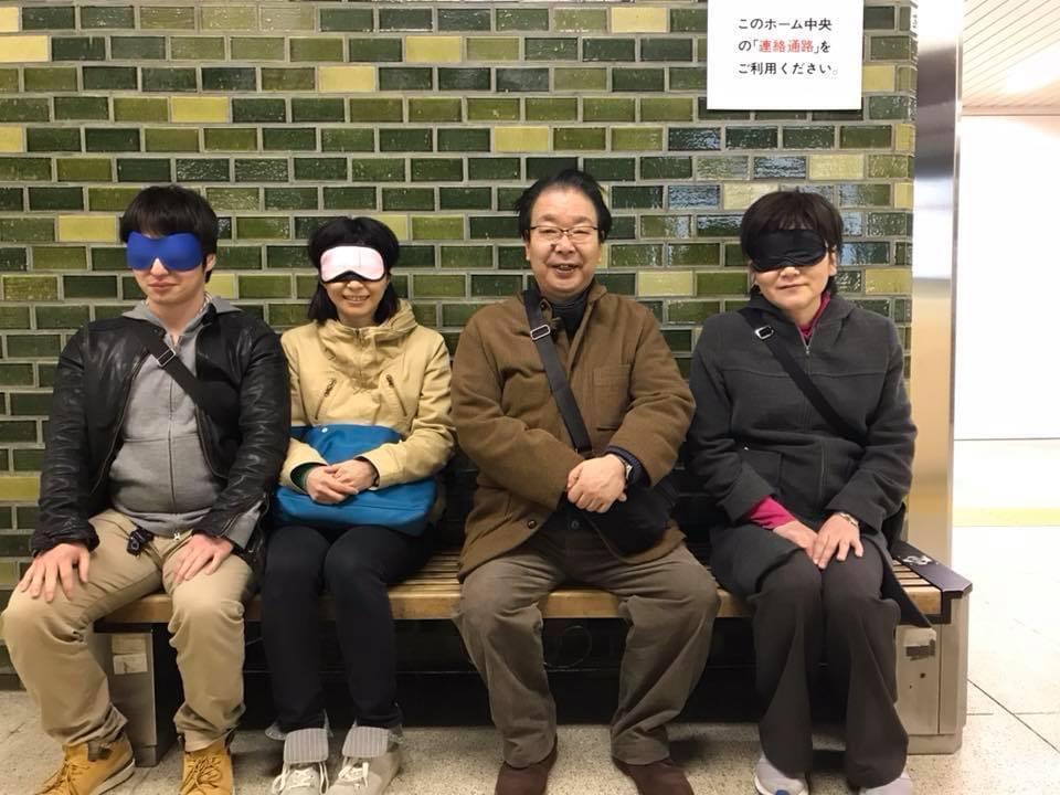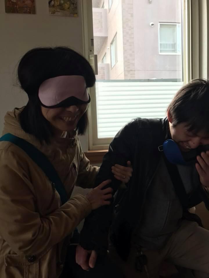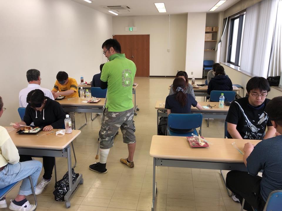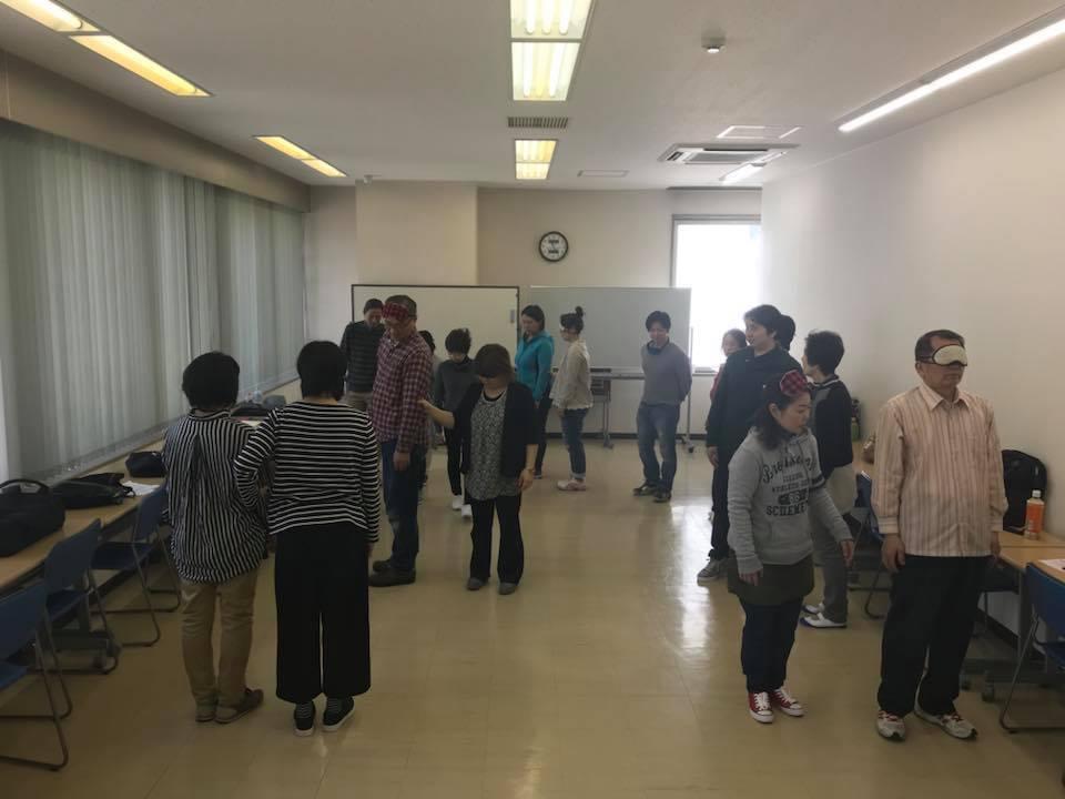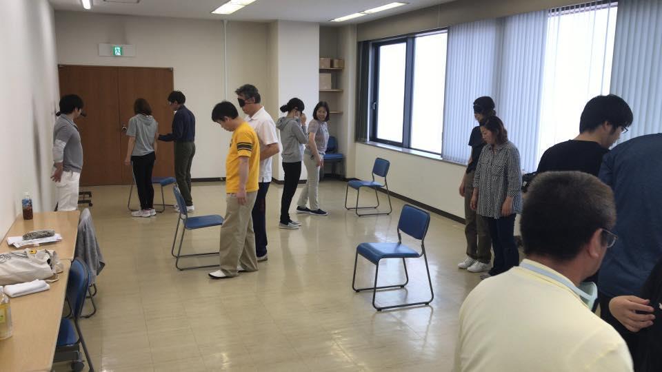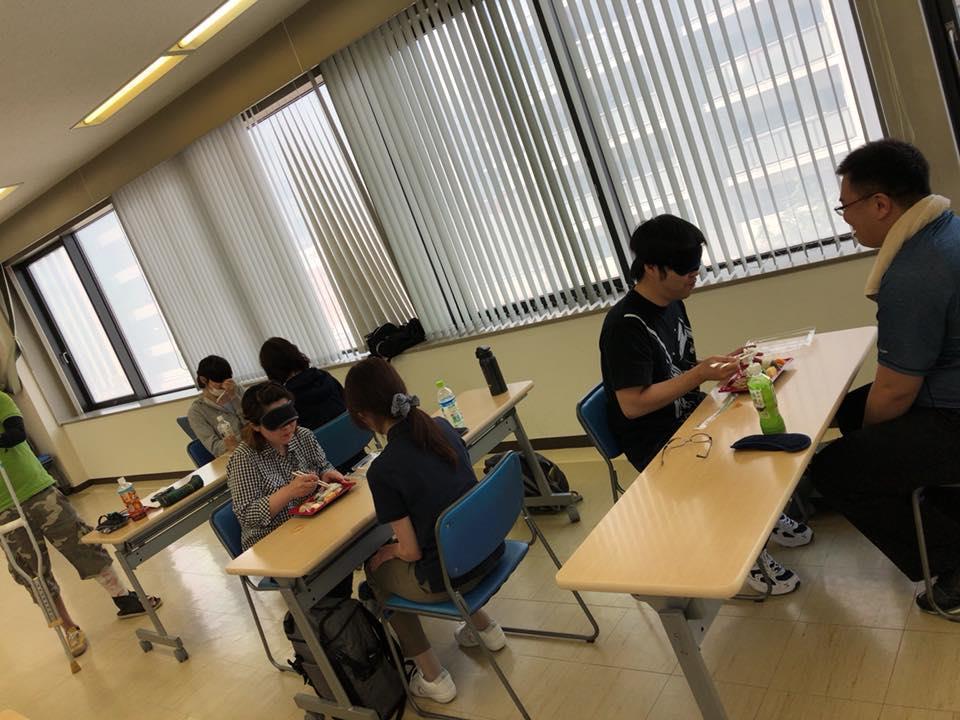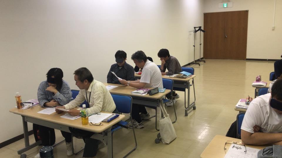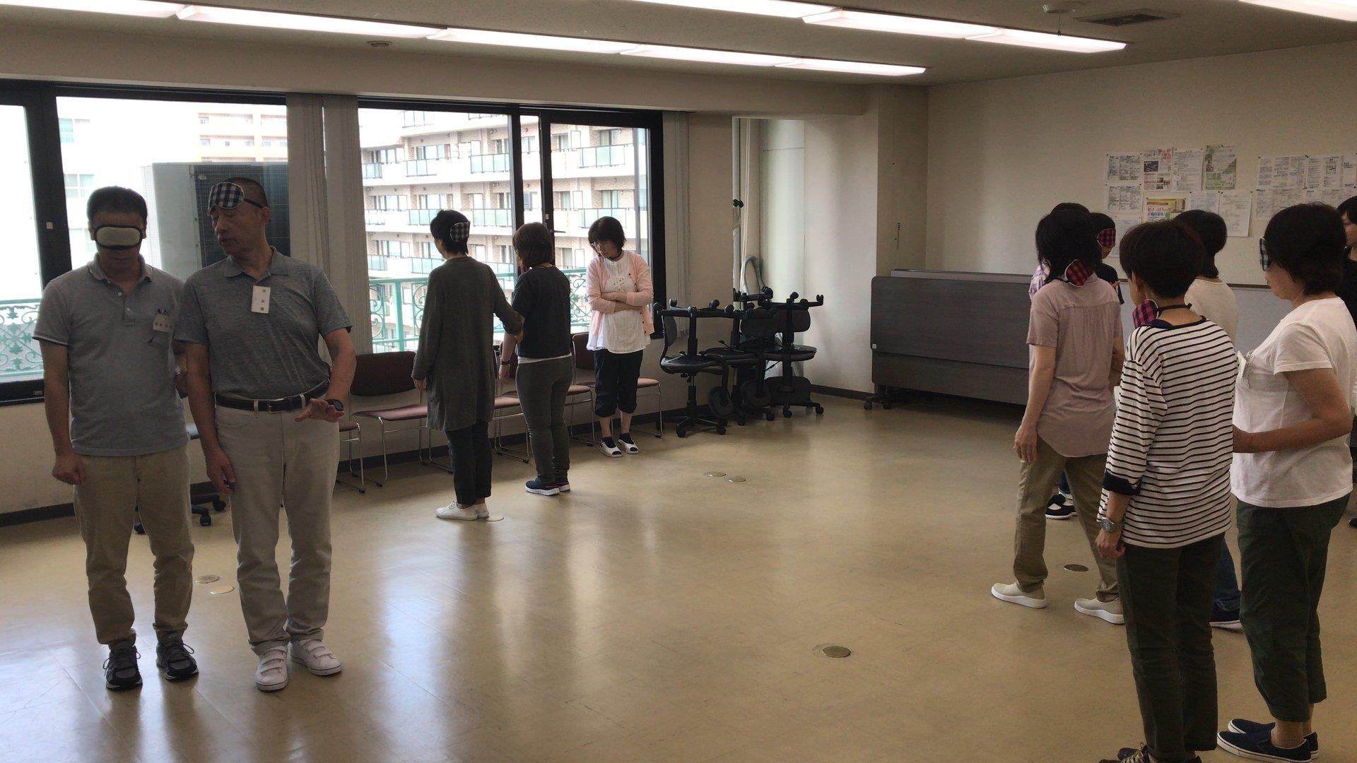 今回は18:00~21:00/9:00~16:30と2日間にかけて、視覚障害者との外出支援の基本を学びました。