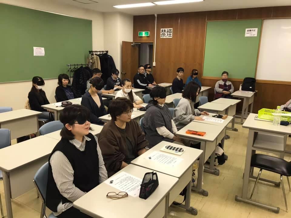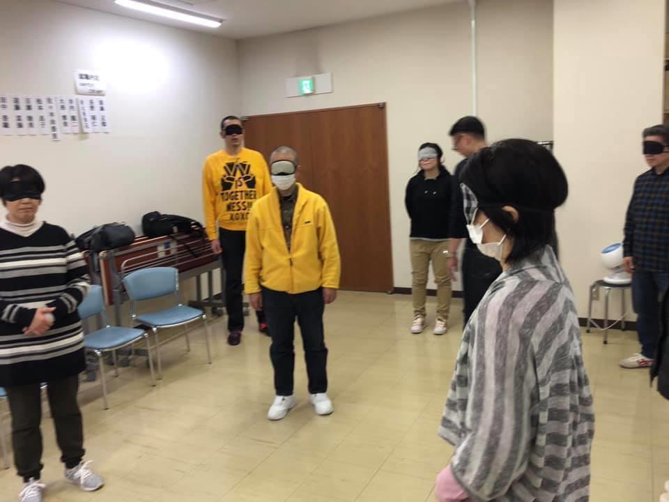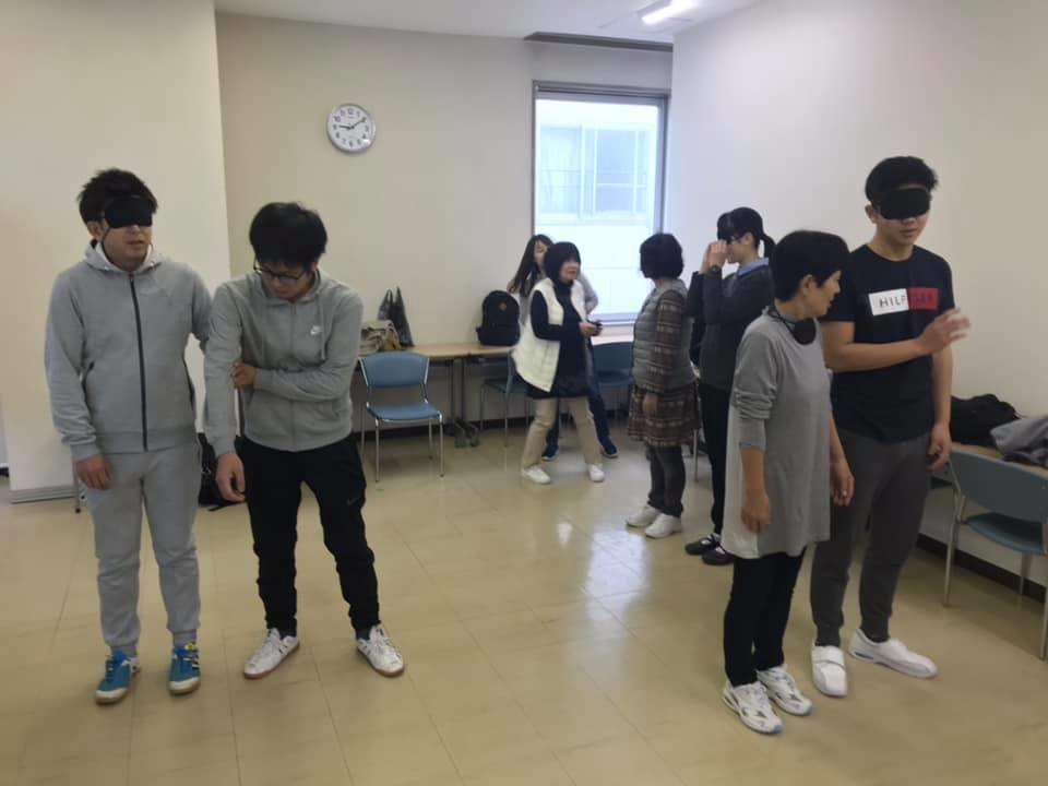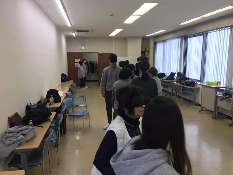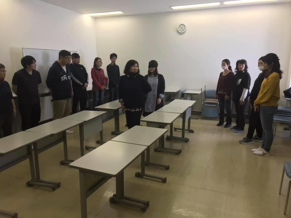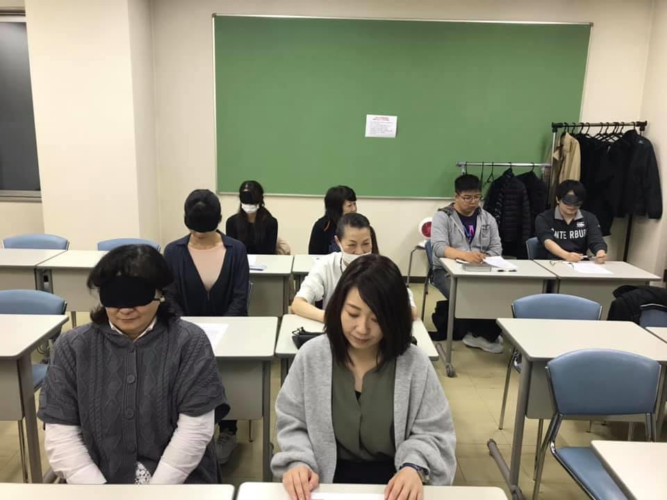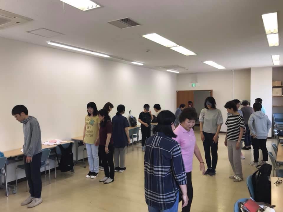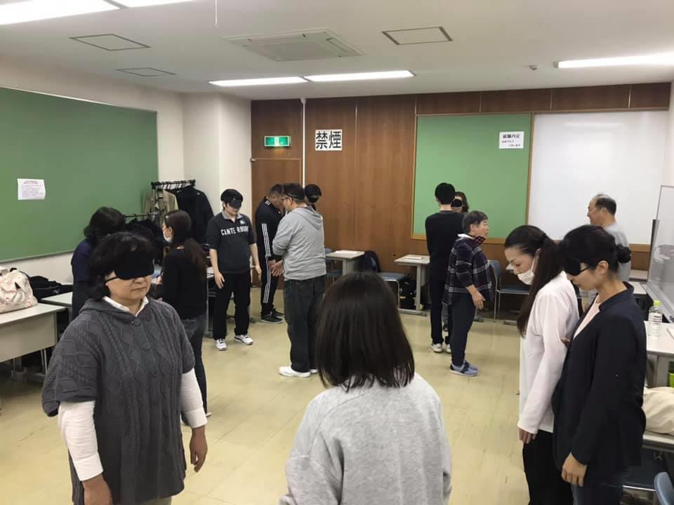 参加者19名、アイマスク体験を通じて、視覚障害者の心理や行動の不便さについて学習しました。