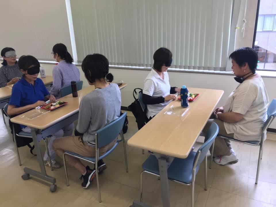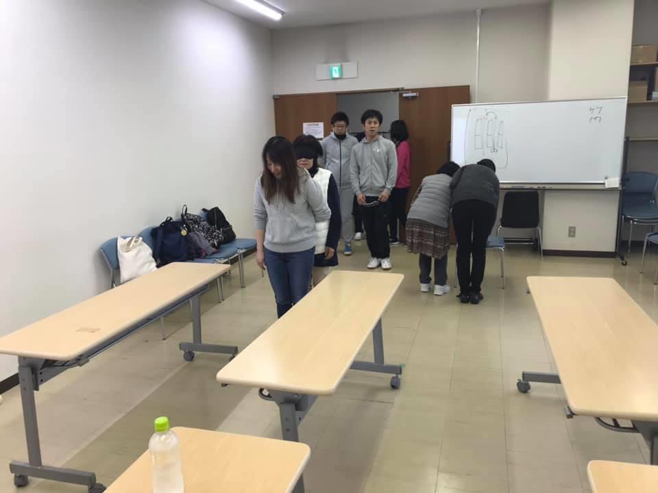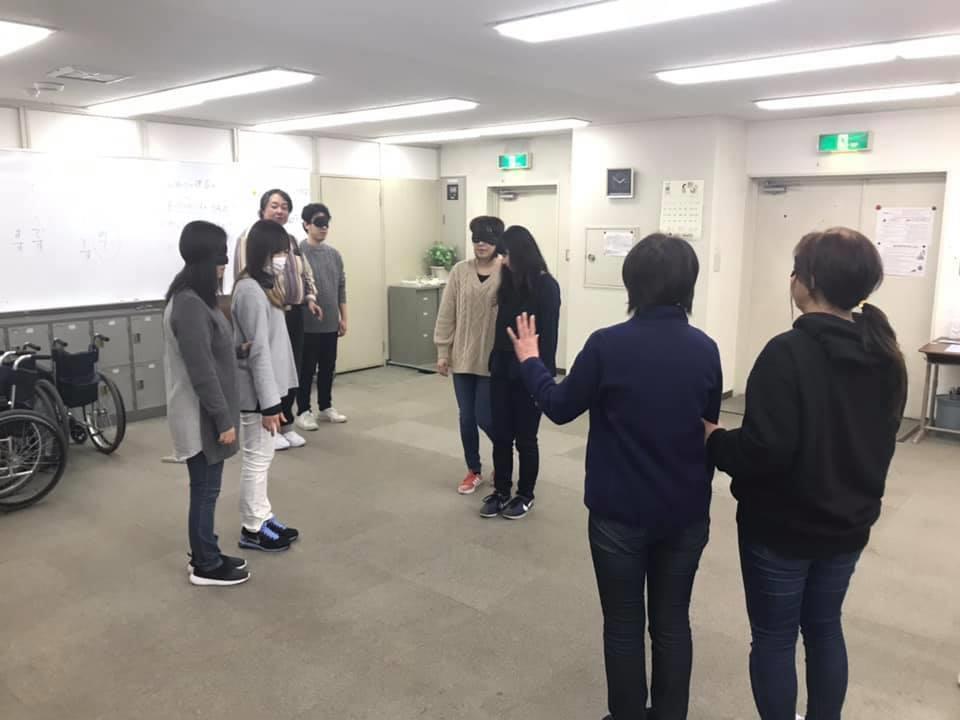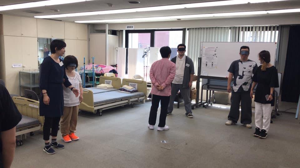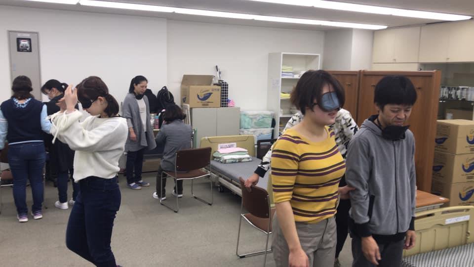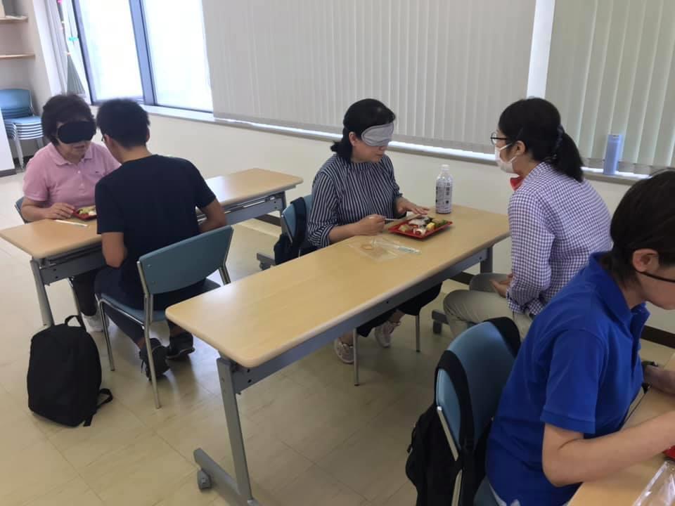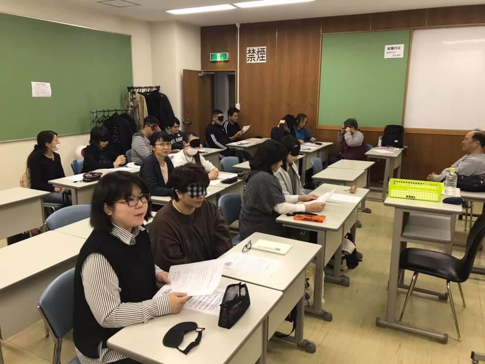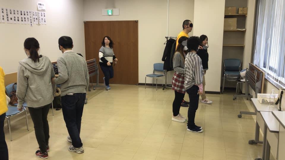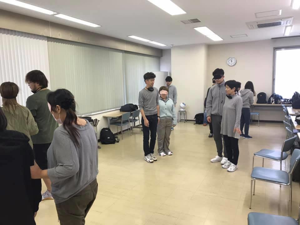 参加者19名、アイマスク体験を通じて、視覚障害者の心理や行動の不便さについて学習しました。