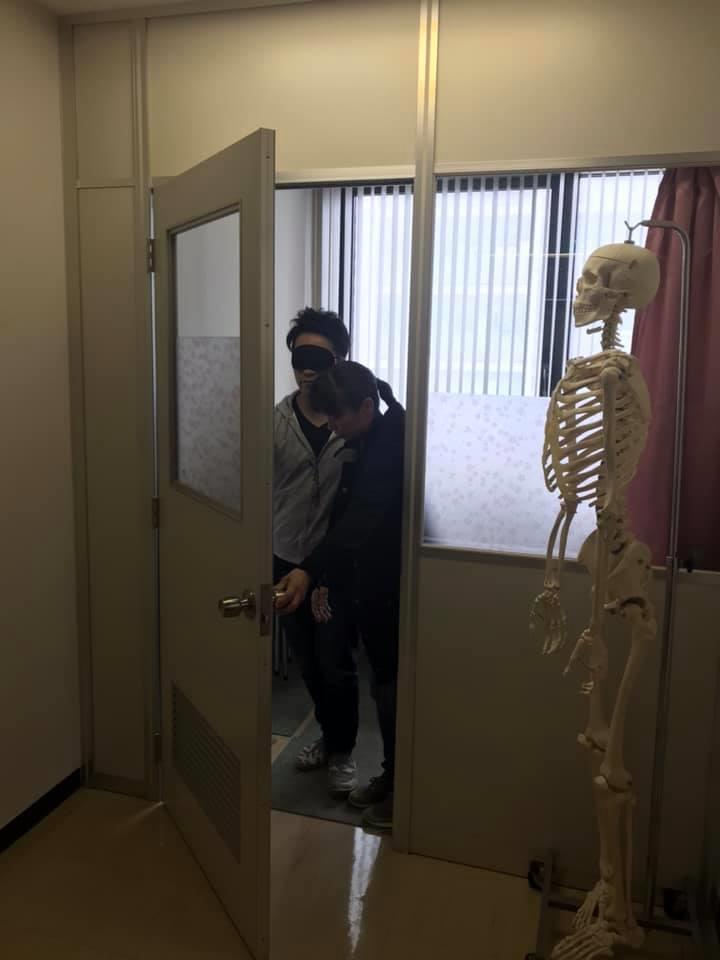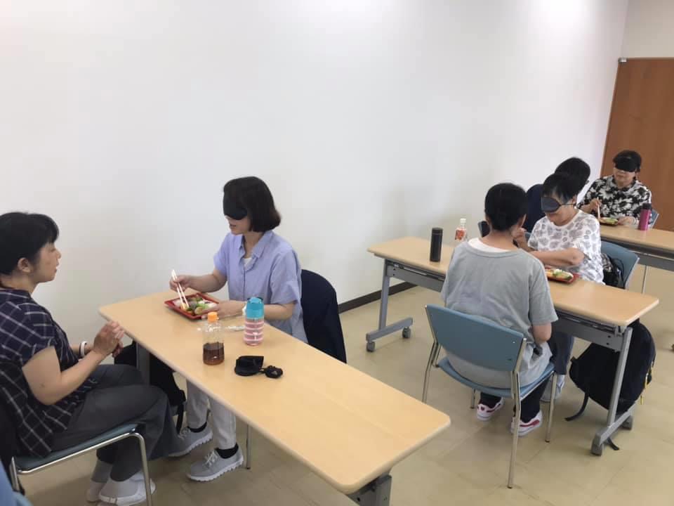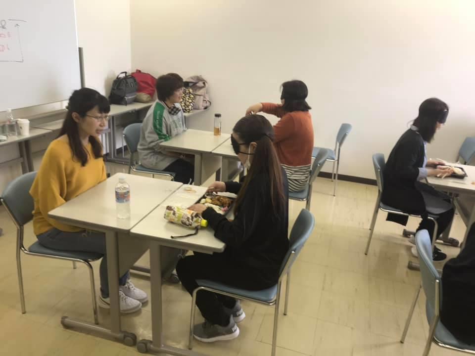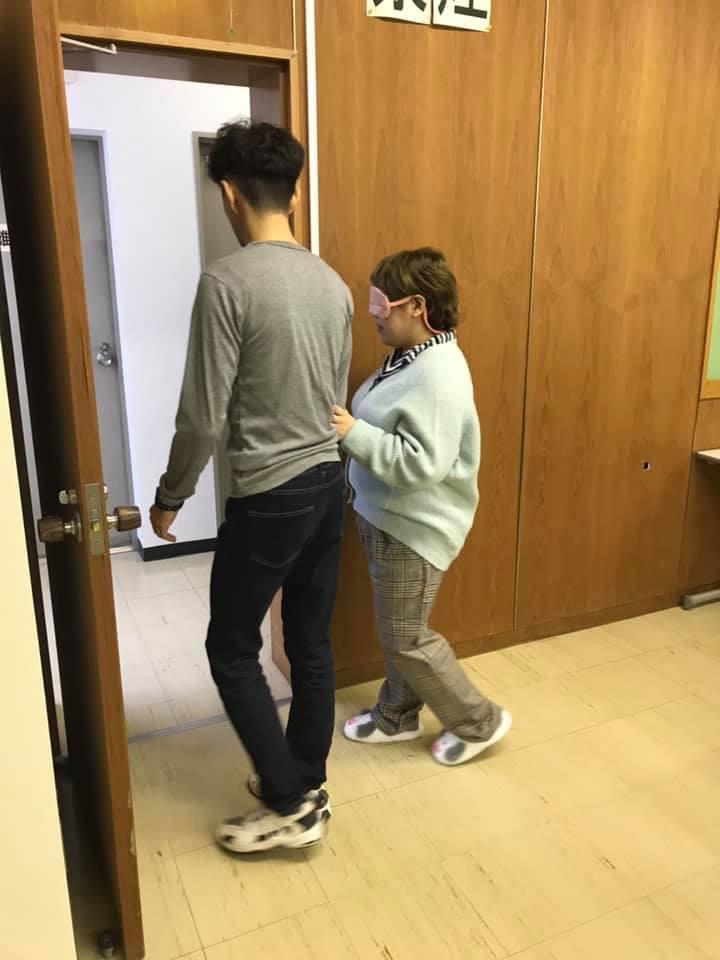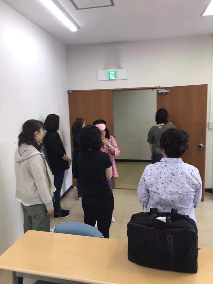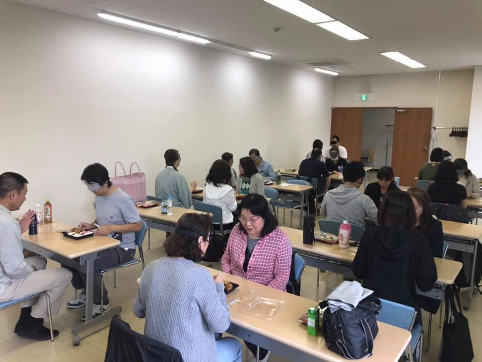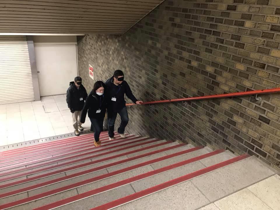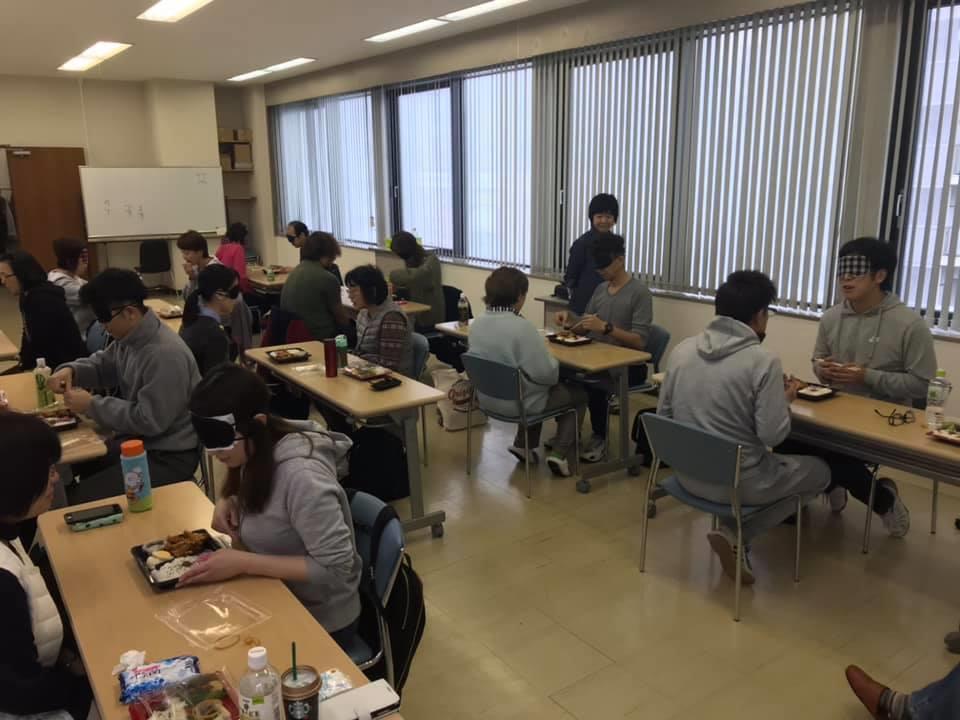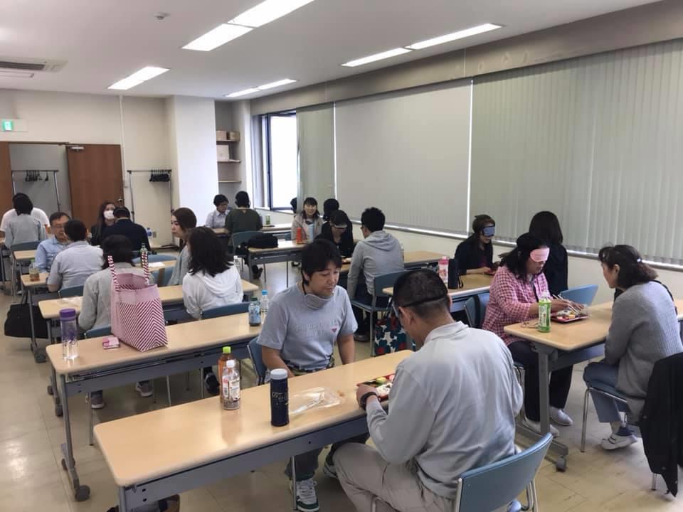 参加者19名、アイマスク体験を通じて、視覚障害者の心理や行動の不便さについて学習しました。