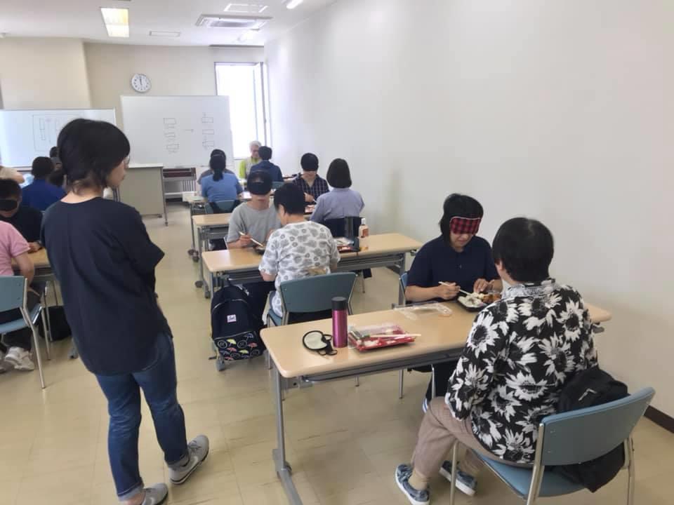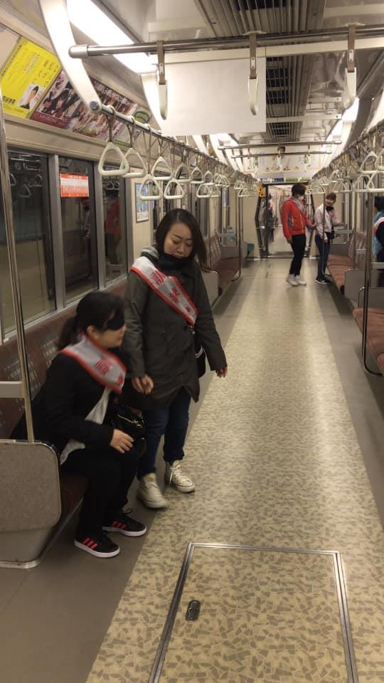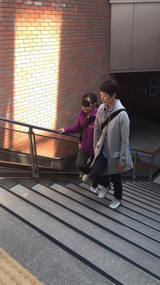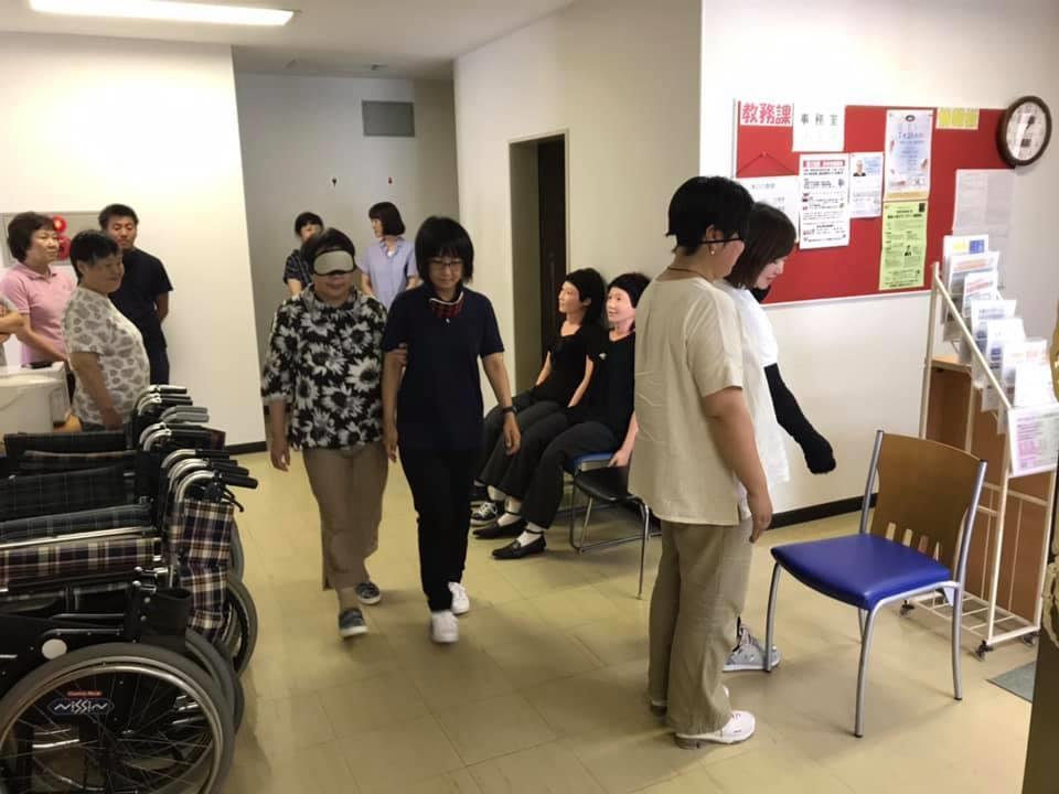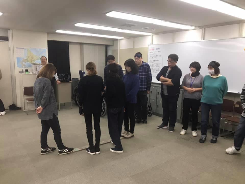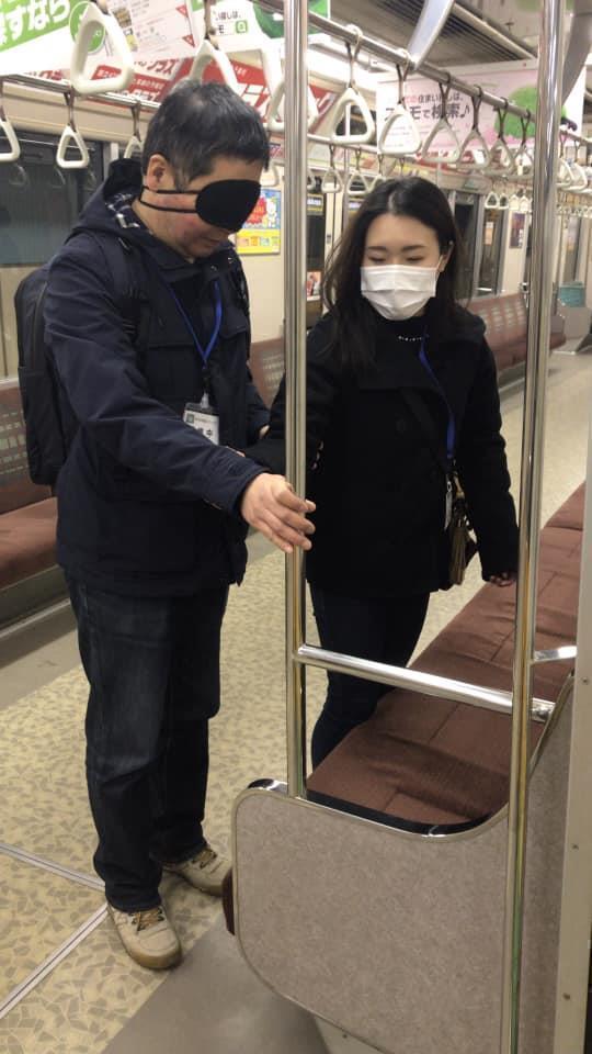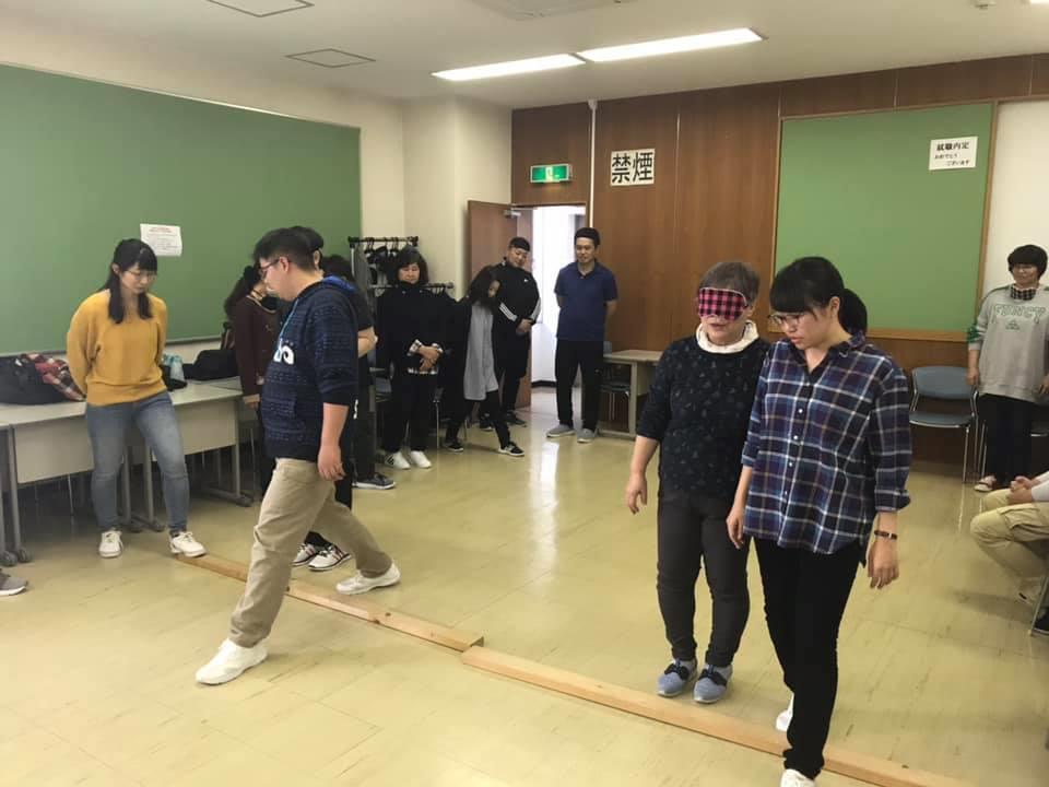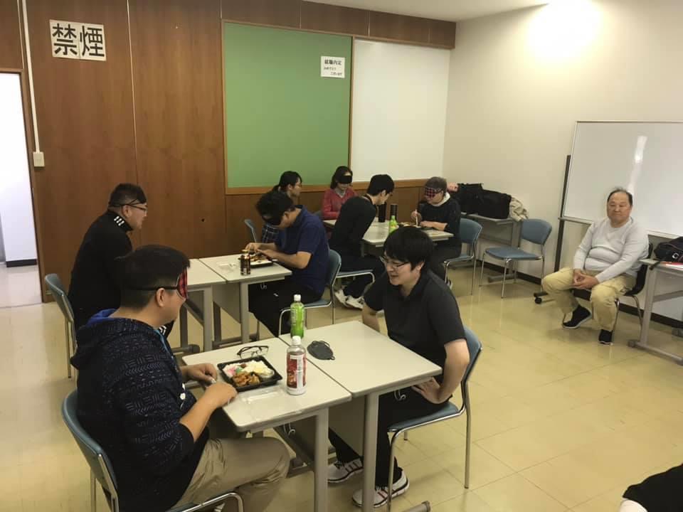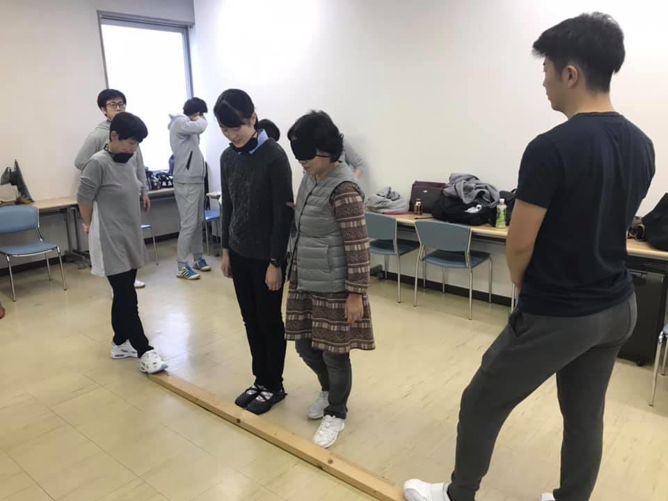参加者19名、アイマスク体験を通じて、視覚障害者の心理や行動の不便さについて学習しました。