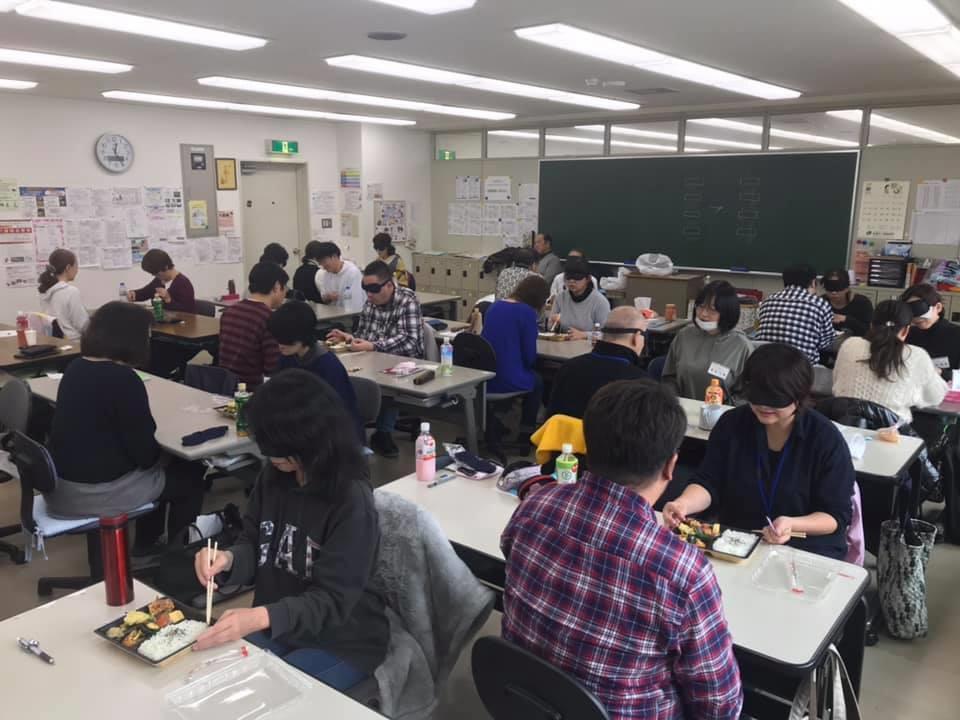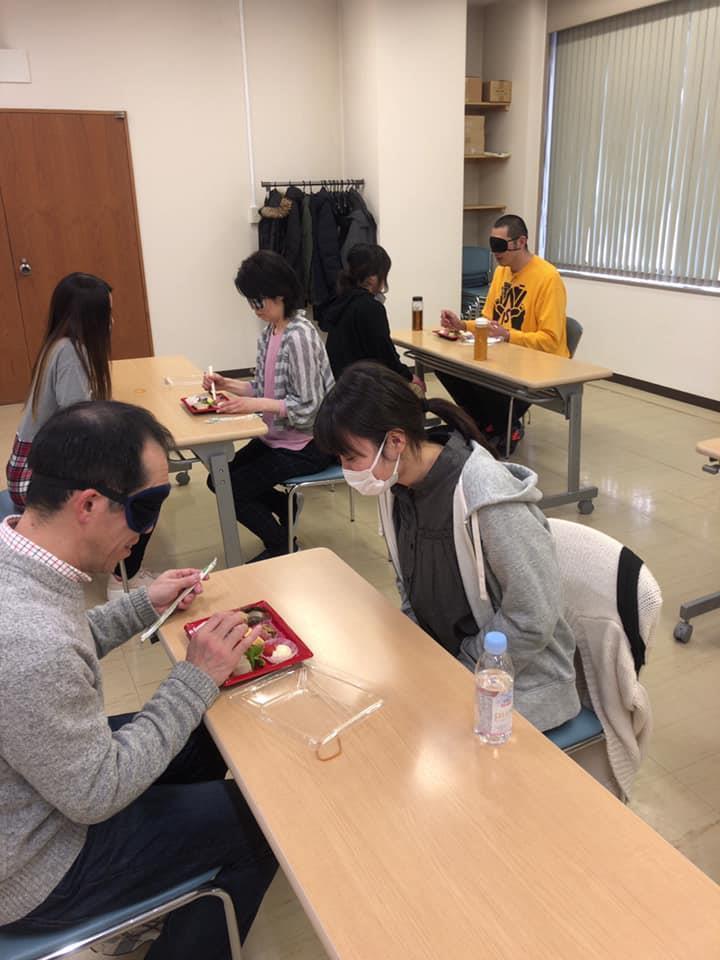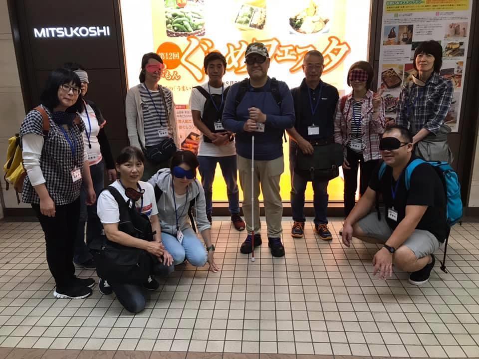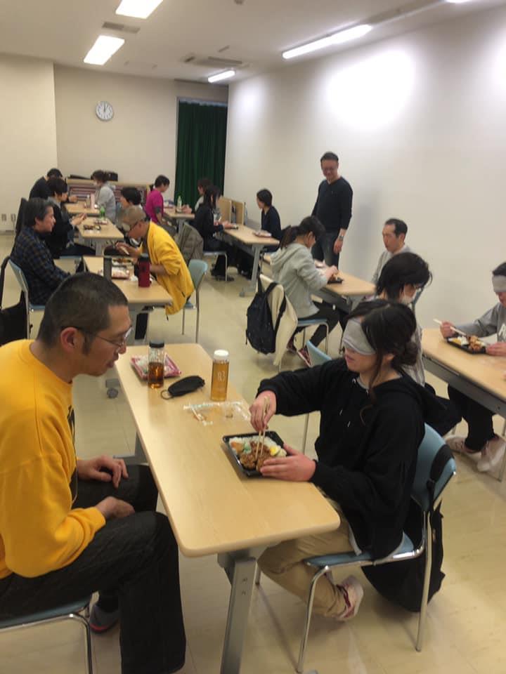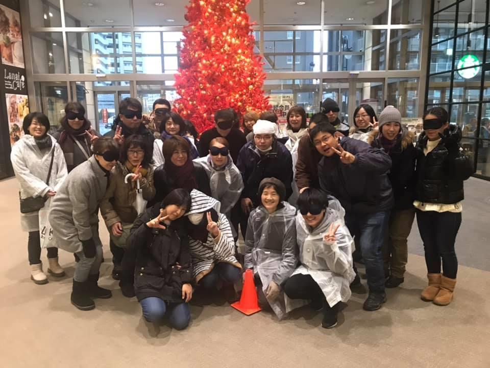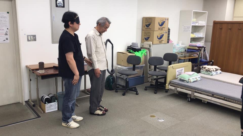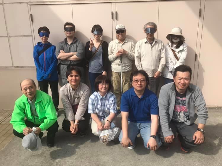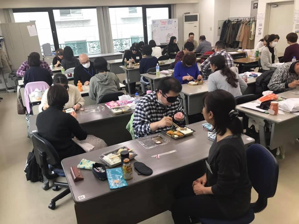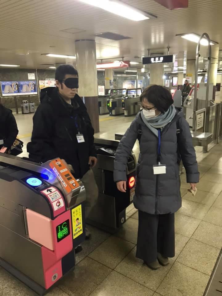 参加者19名、アイマスク体験を通じて、視覚障害者の心理や行動の不便さについて学習しました。