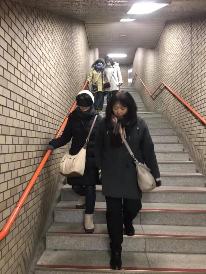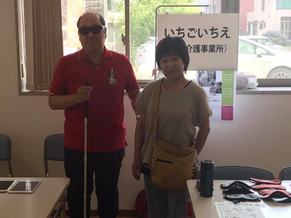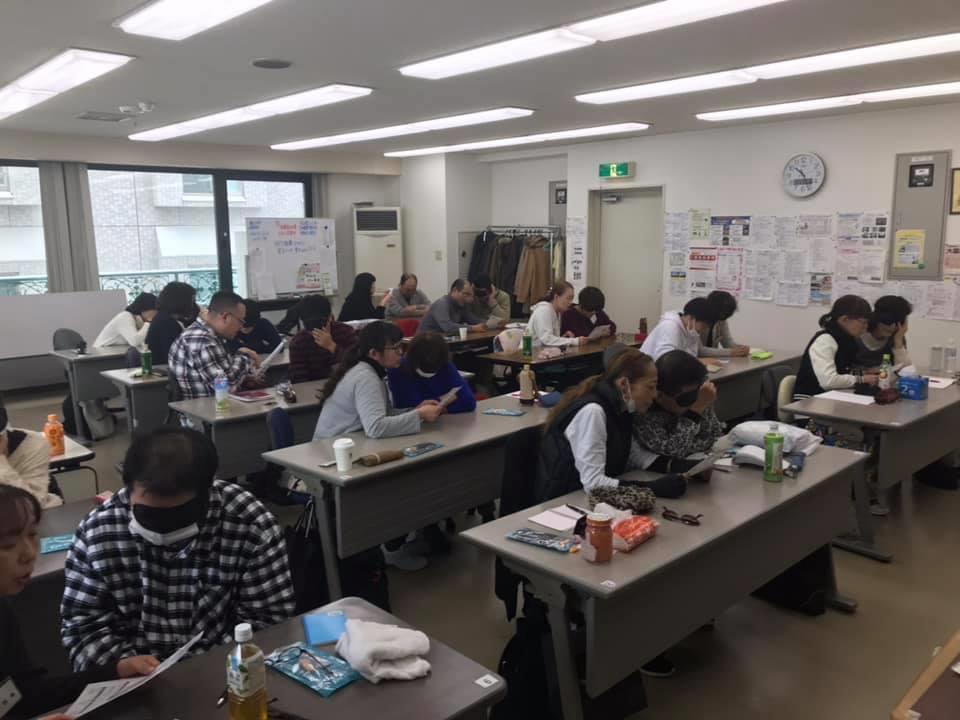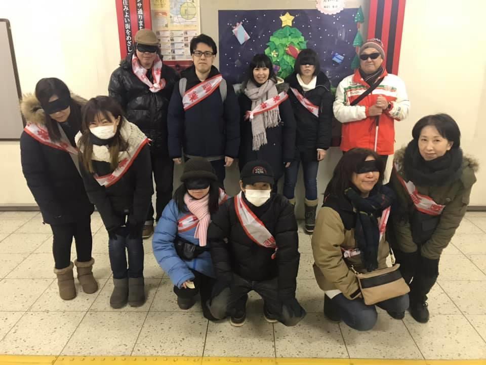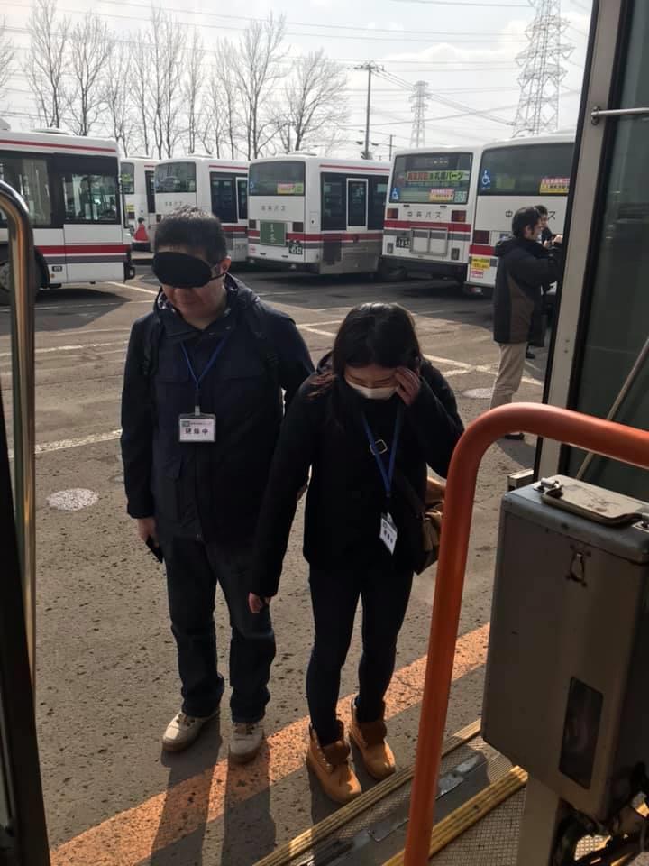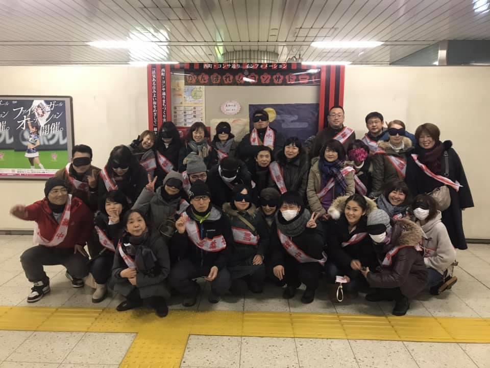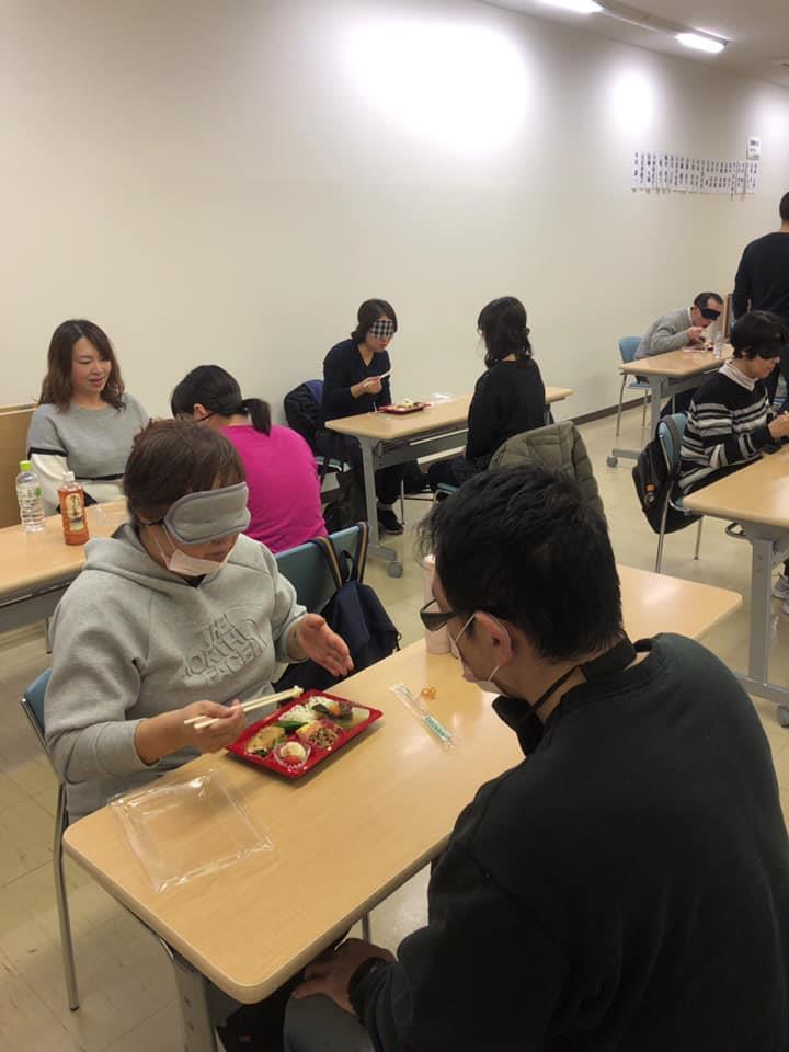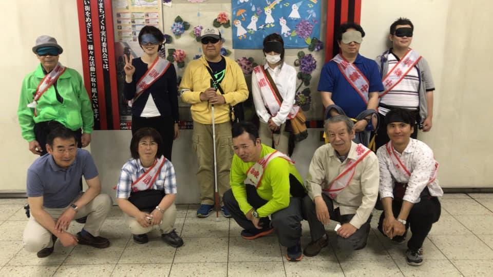 参加者19名、アイマスク体験を通じて、視覚障害者の心理や行動の不便さについて学習しました。