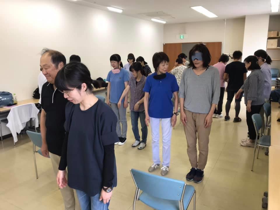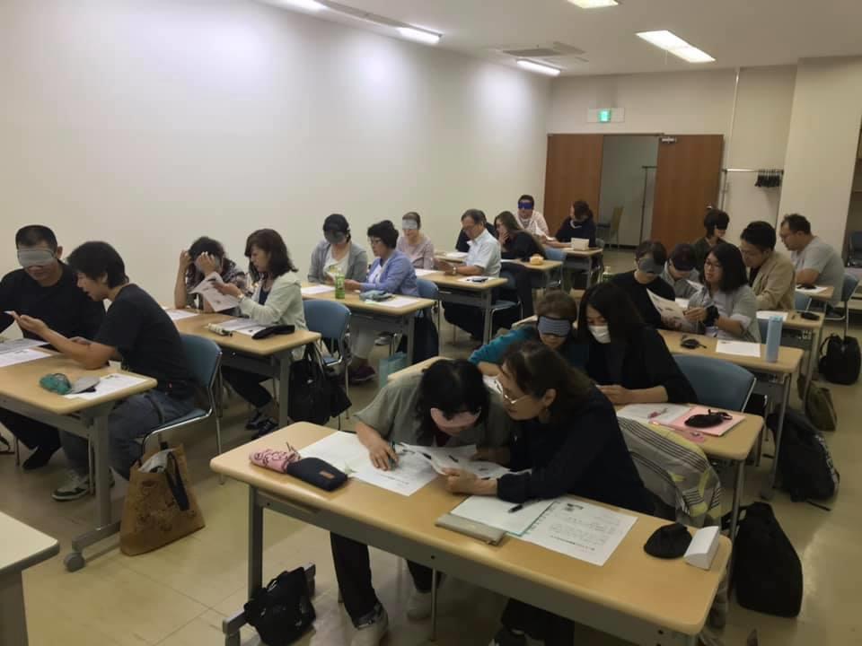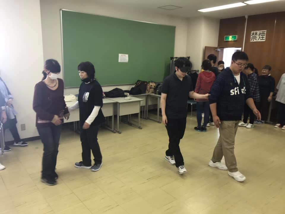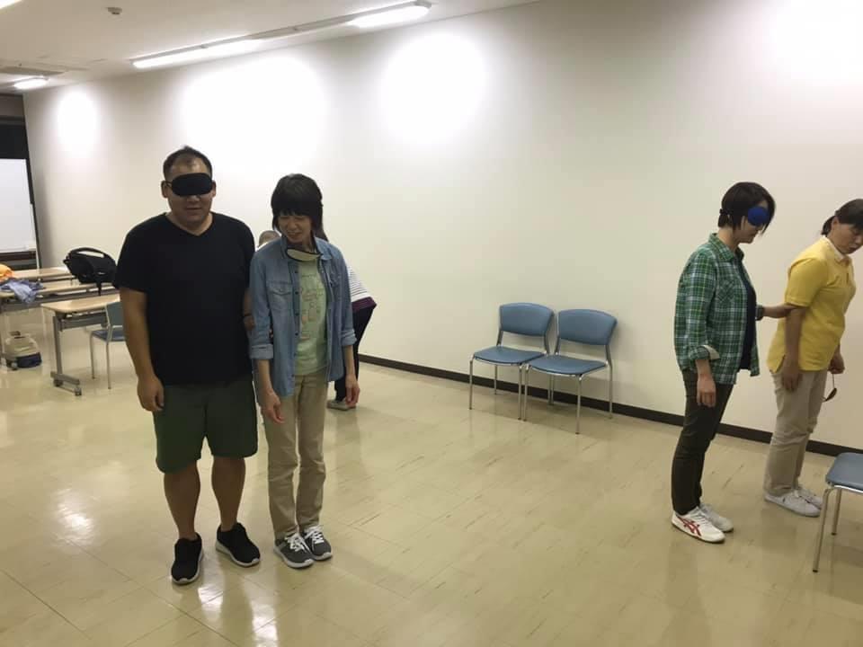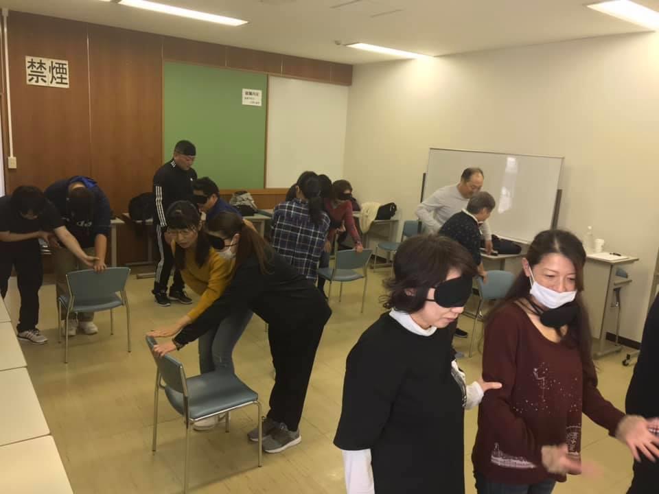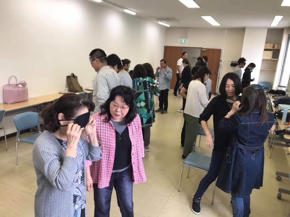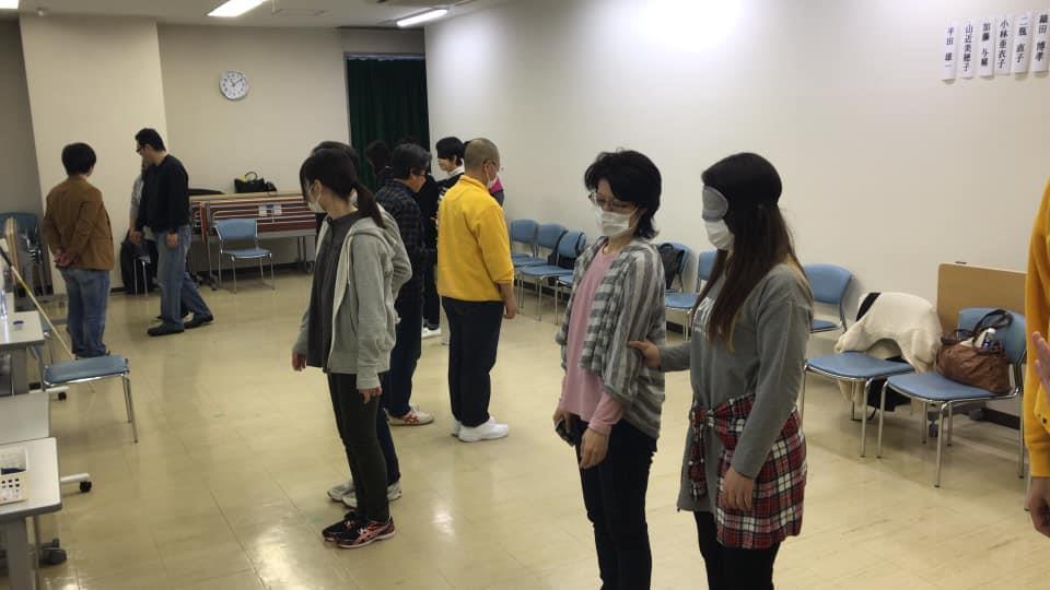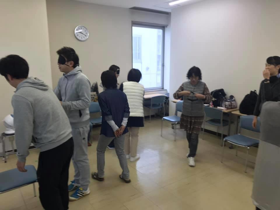 参加者29名(応用課程30名)、生徒さんから一般参加者まで各々がアイマスク体験を通じて、見えない心理、手引きの重要度等を学習しました。