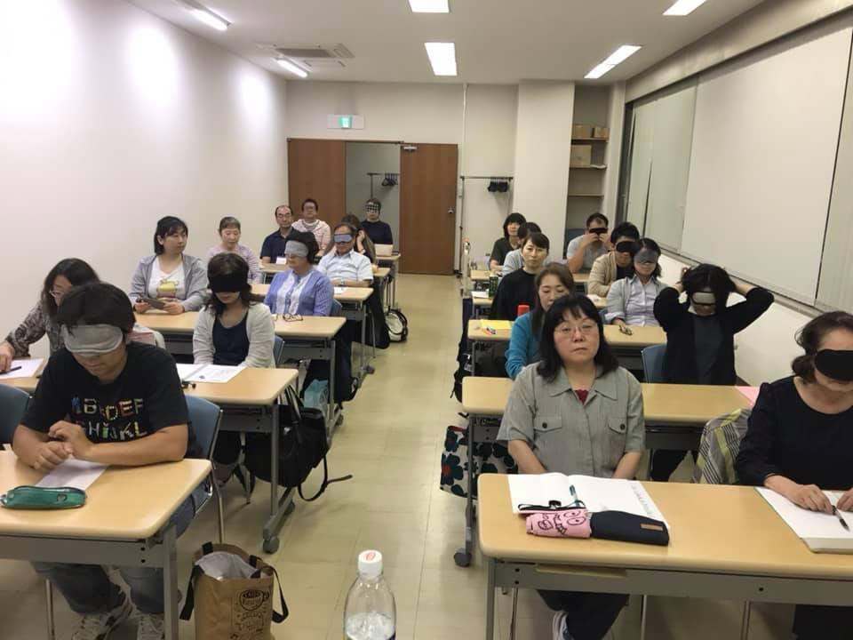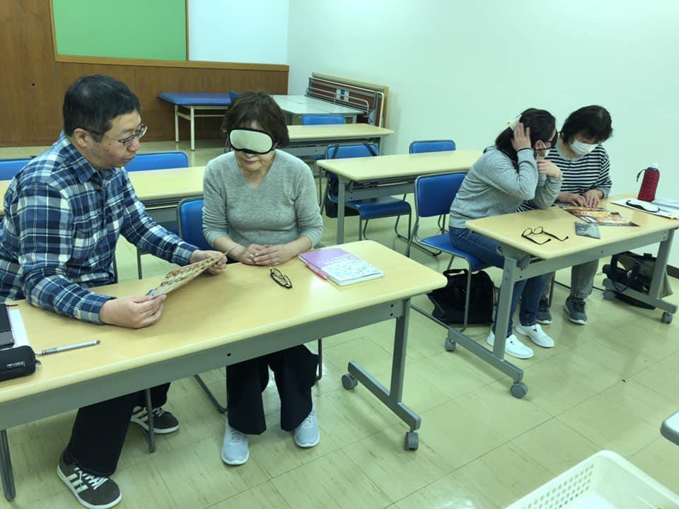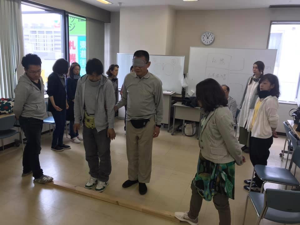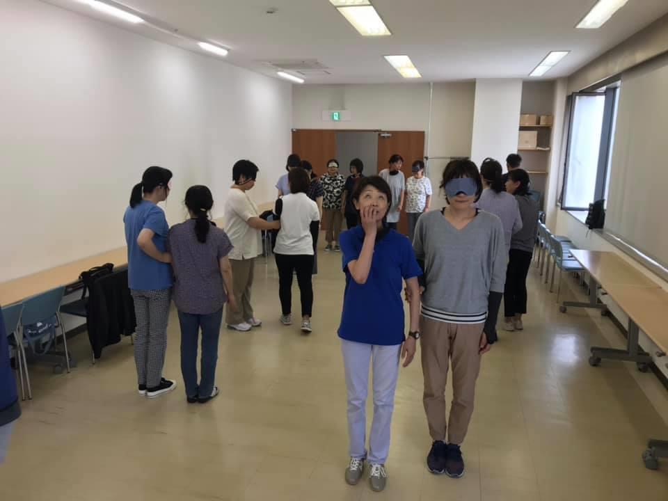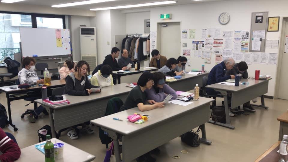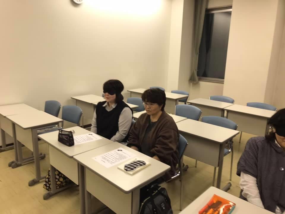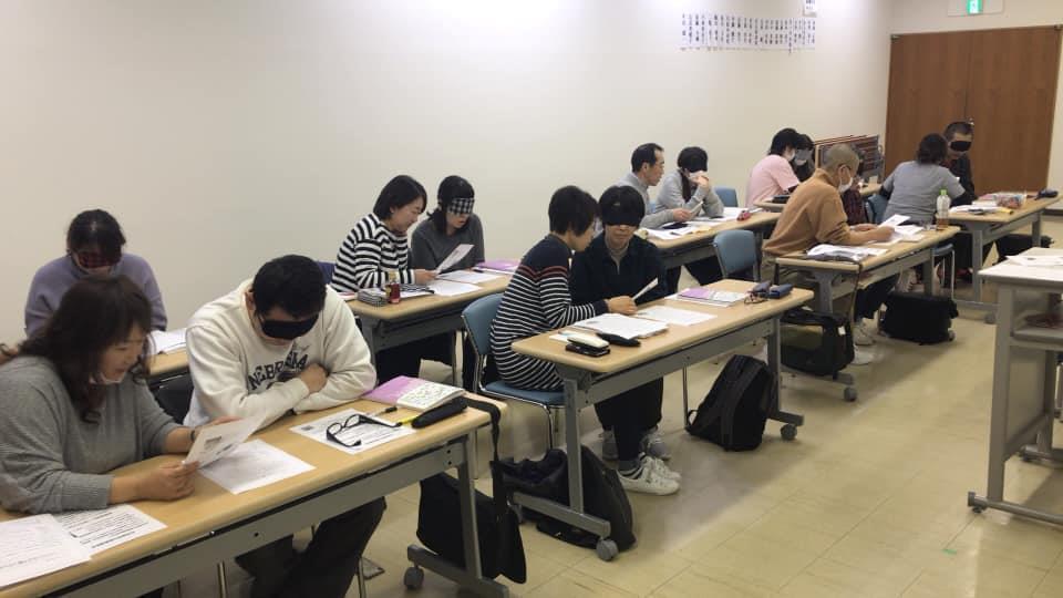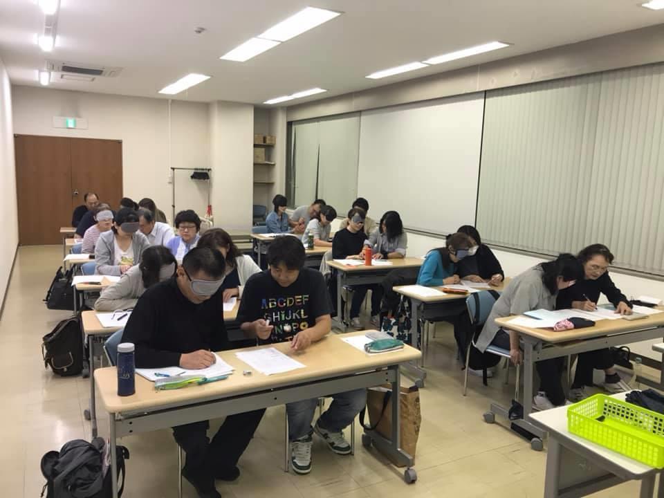 参加者29名(応用課程30名)、生徒さんから一般参加者まで各々がアイマスク体験を通じて、見えない心理、手引きの重要度等を学習しました。