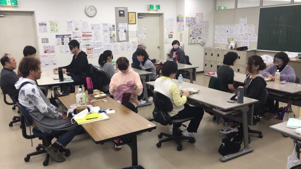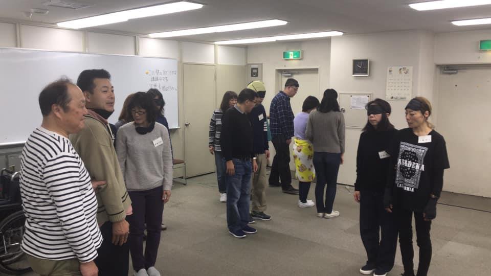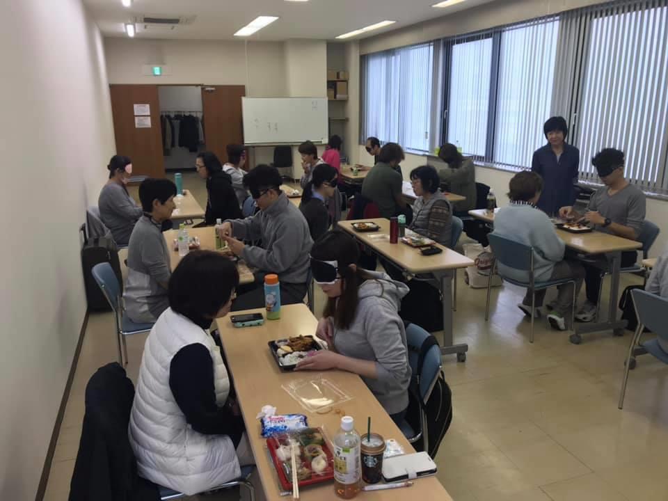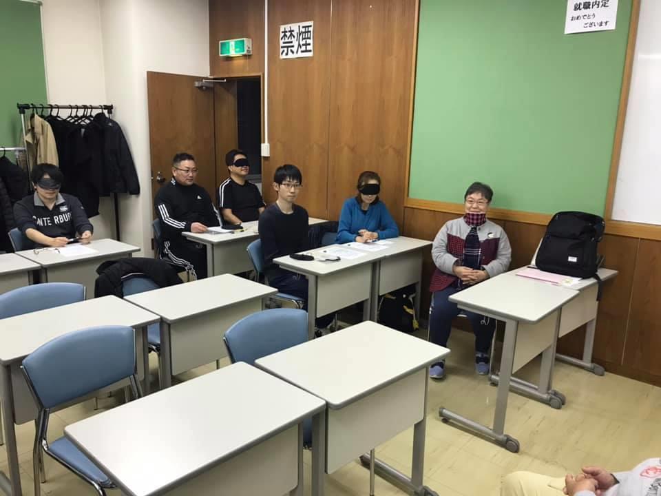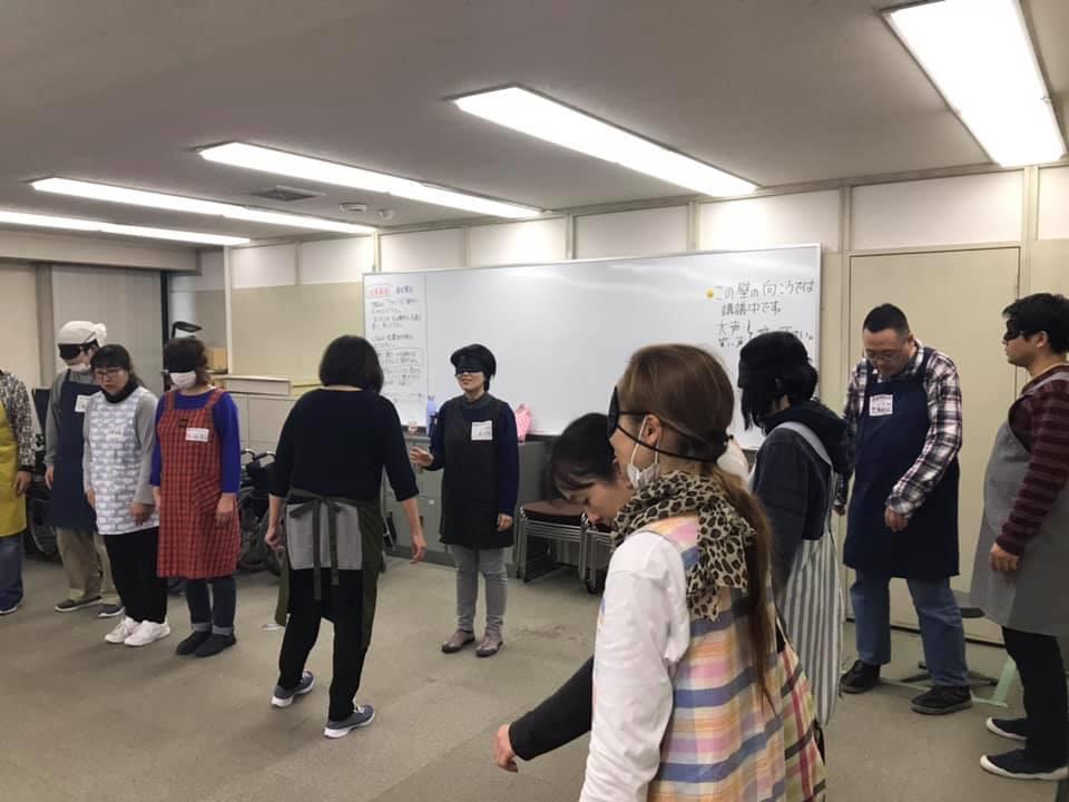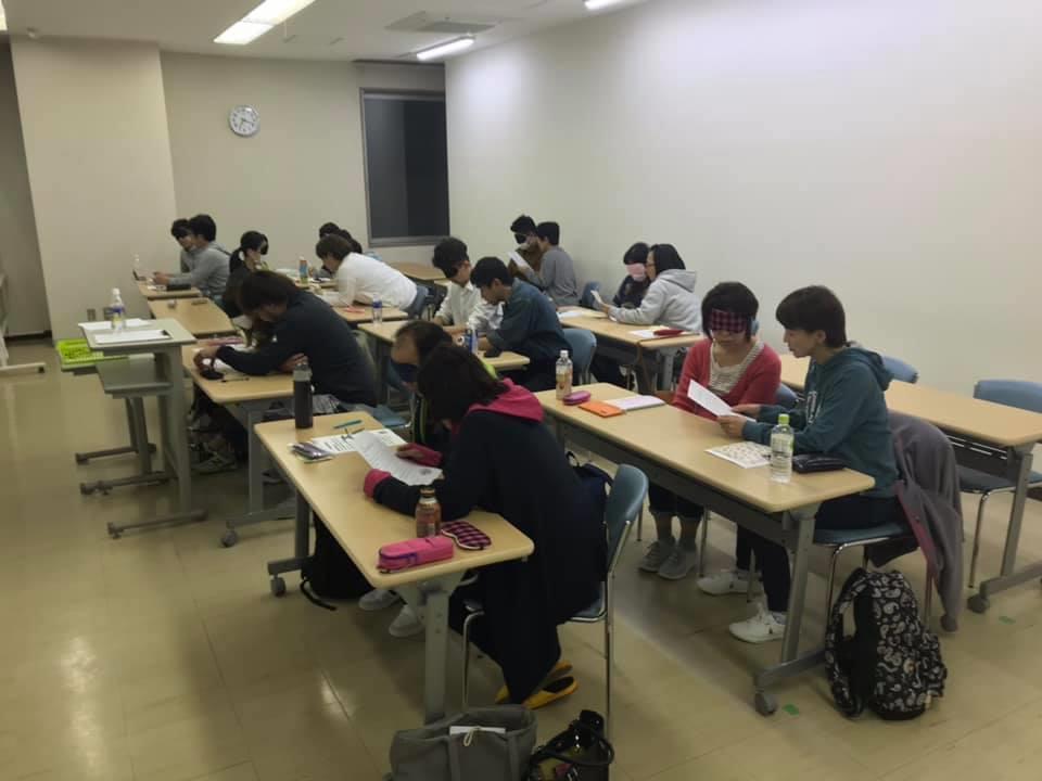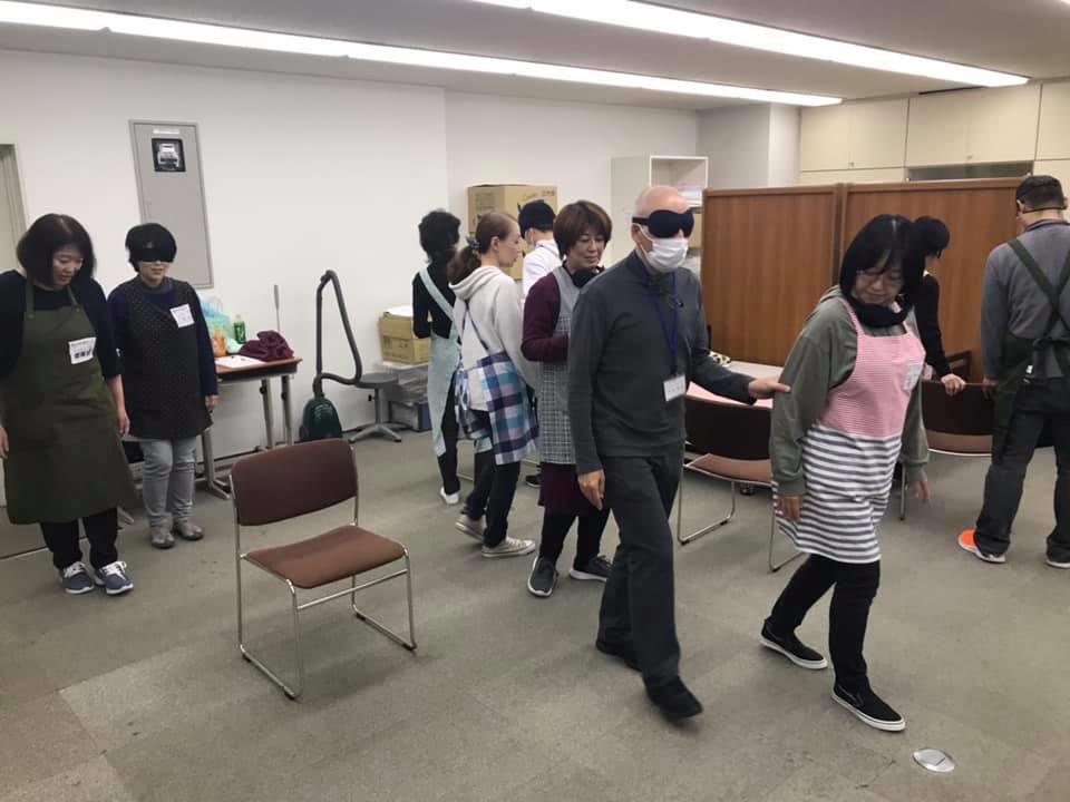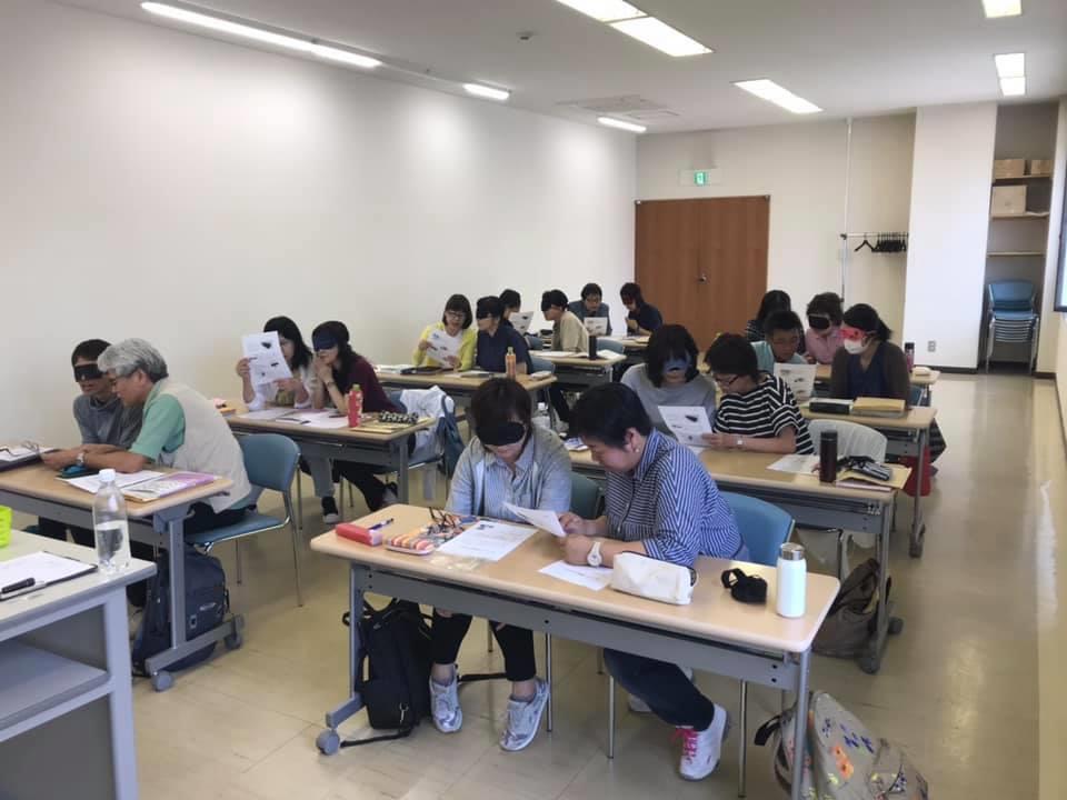 参加者29名(応用課程30名)、生徒さんから一般参加者まで各々がアイマスク体験を通じて、見えない心理、手引きの重要度等を学習しました。