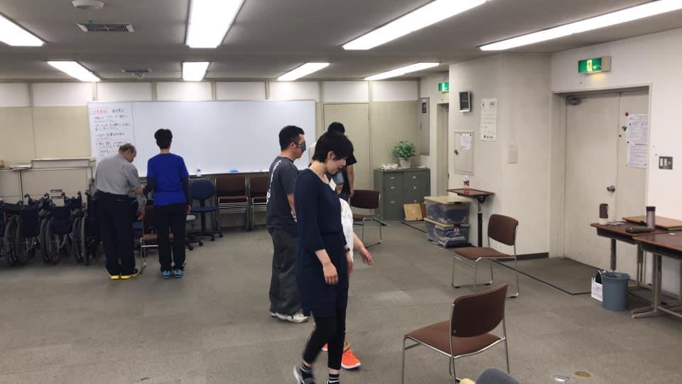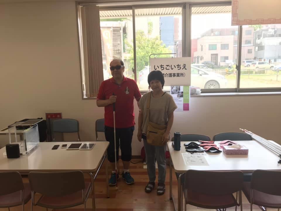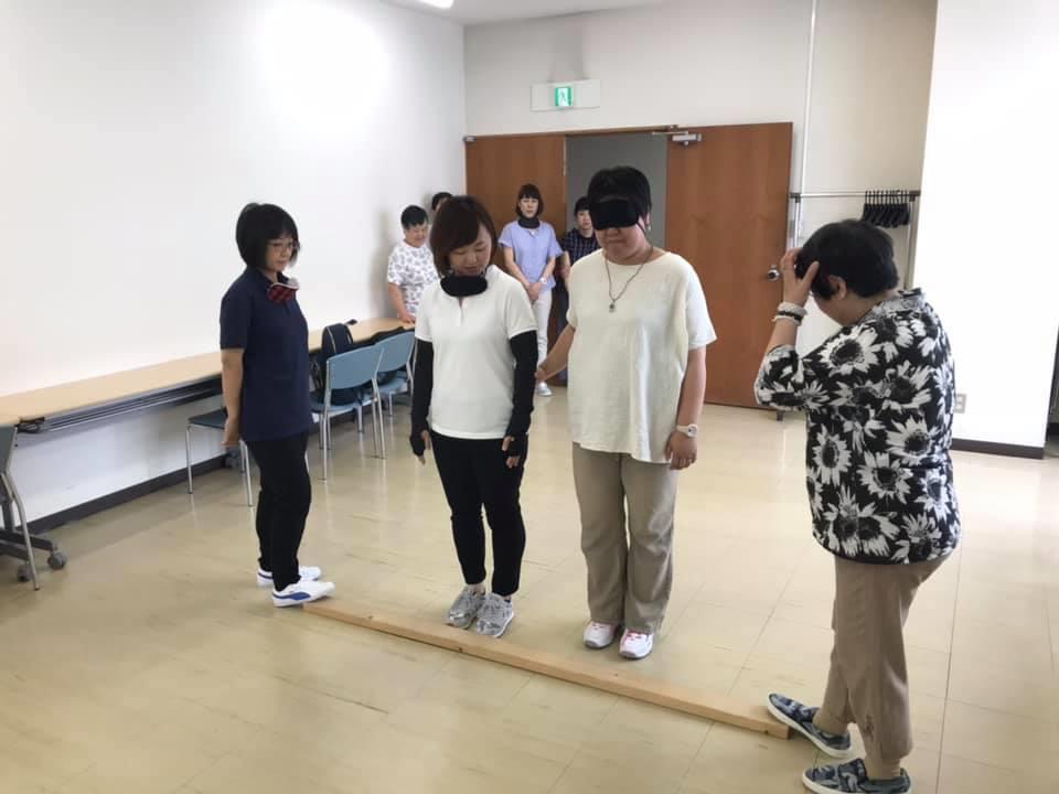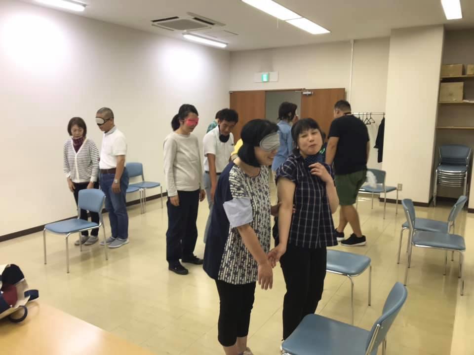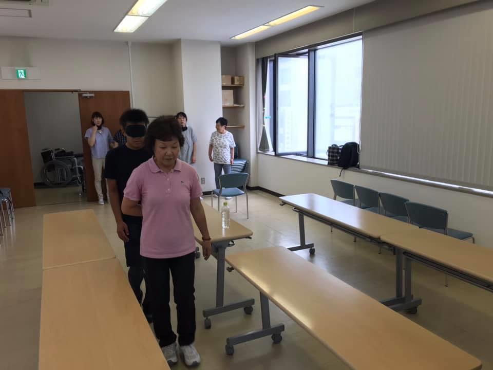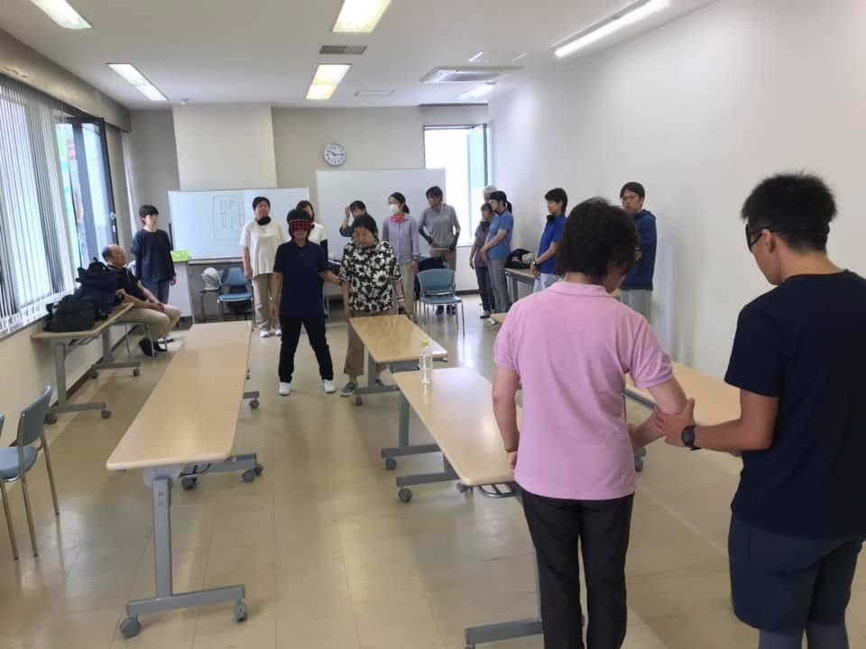 参加者10名、各々がアイマスク体験を通じて、見えないという心理や手引き移動等を学習しました。