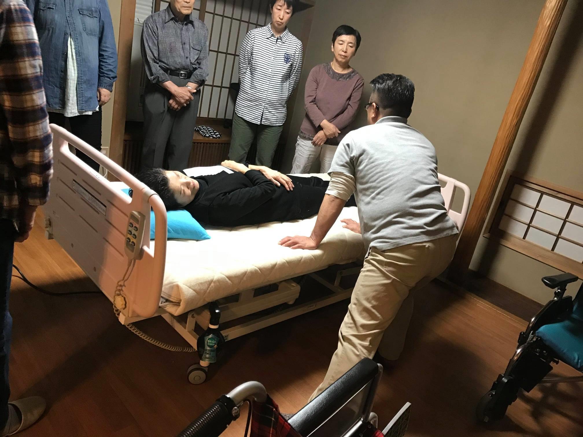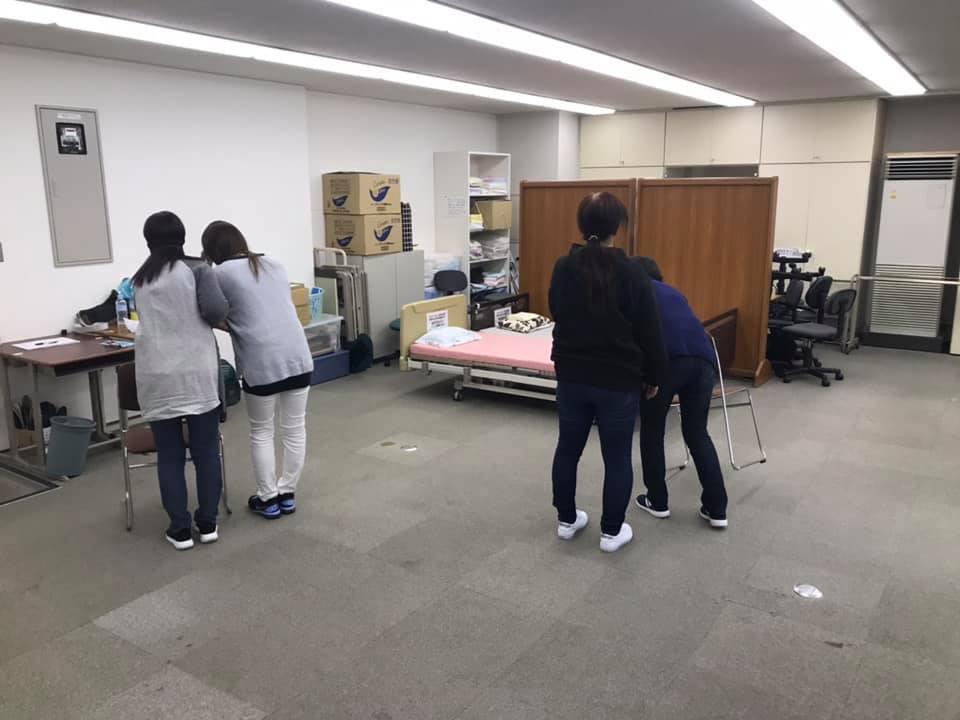 10月31日、定期社内会議は西野学園より藤井先生にお越しいただき身体介護の基礎としてベッド上での端座位、車いすへの移乗を教えていただきました。
