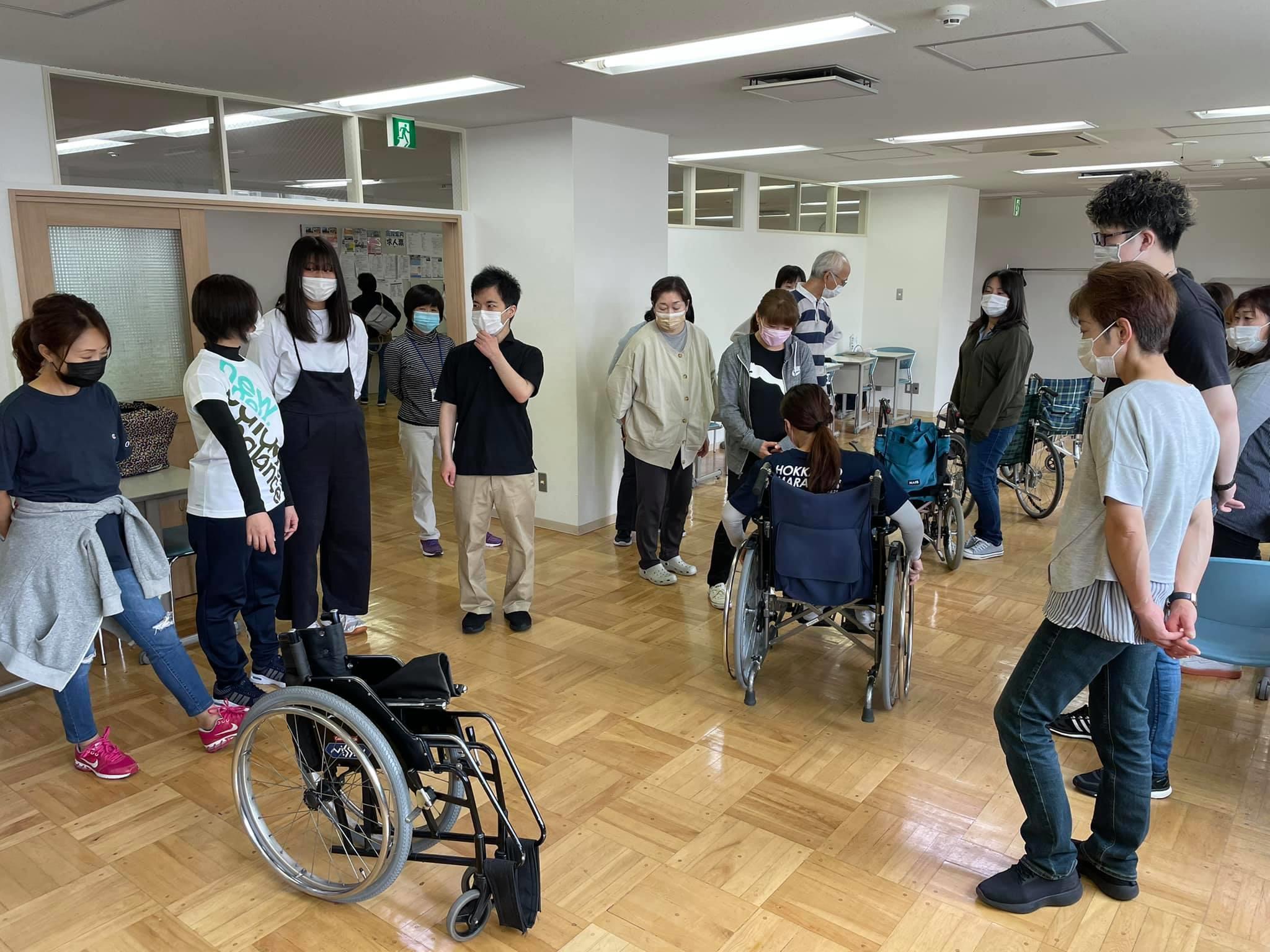 6月19日(参加者20名)車いすの構造、基本操作から公共機関を利用しての外出迄を学習致しました。