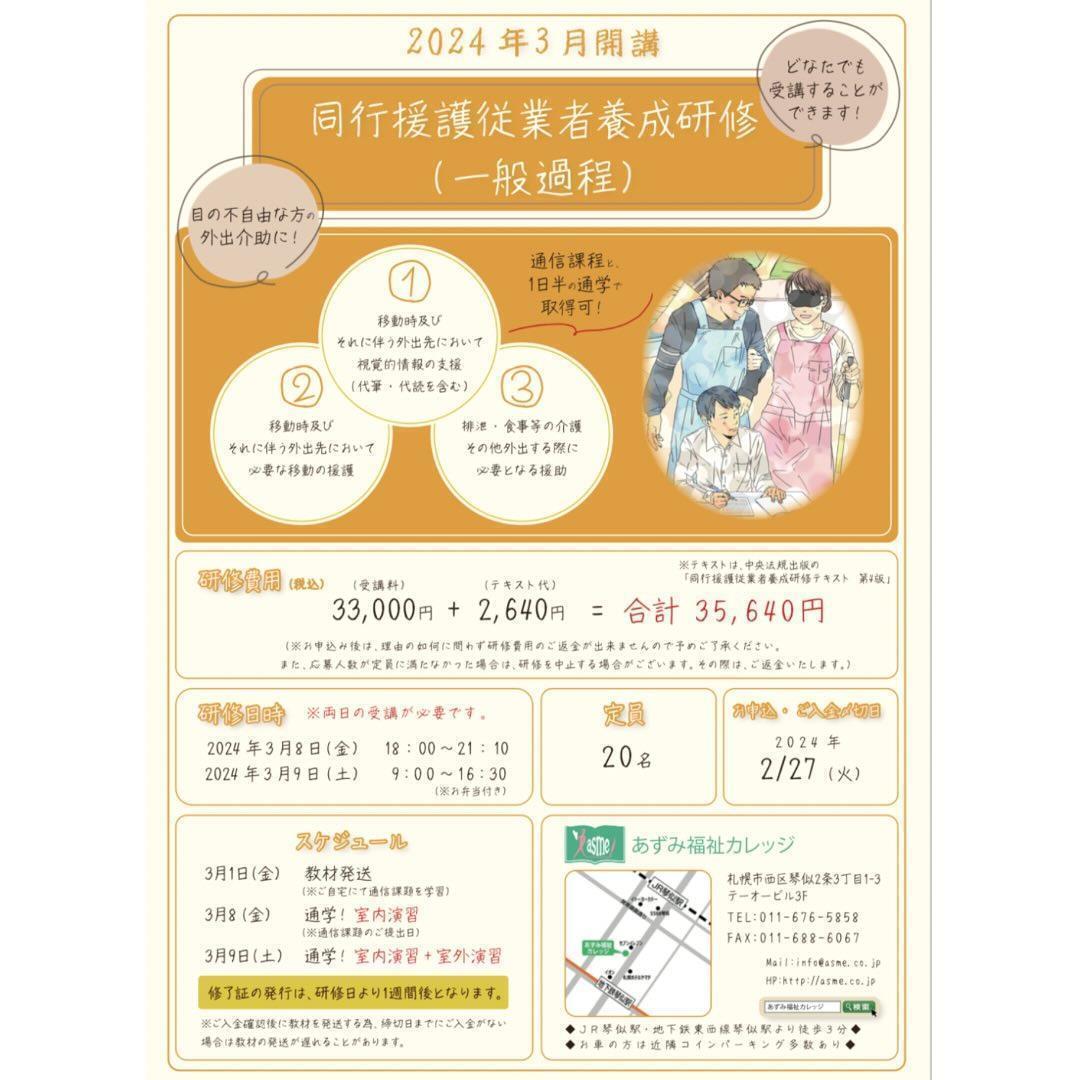 3月8日(金)と9日(土)の2日間で、同行援護従事者養成研修(一般課程)を開催いたします。